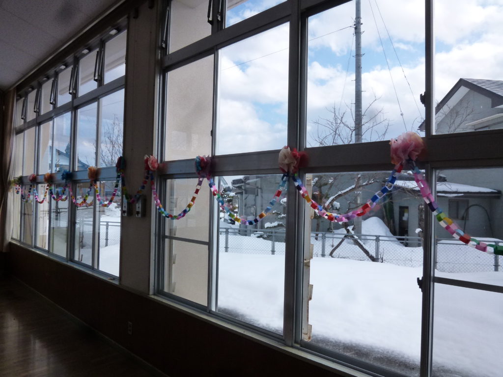 リズム室一周できるくらいまで長ーーくなりました。輪つなぎと一緒にお花も飾って飾り付けは完了!