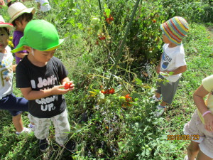 なす、とまとチームには3歳児が多く、「先生!食べていい??」とおいしいとまとを早く食べたくて待ちきれない様子でした。収穫後、皆でとまとを食べて満足気な表情でした。