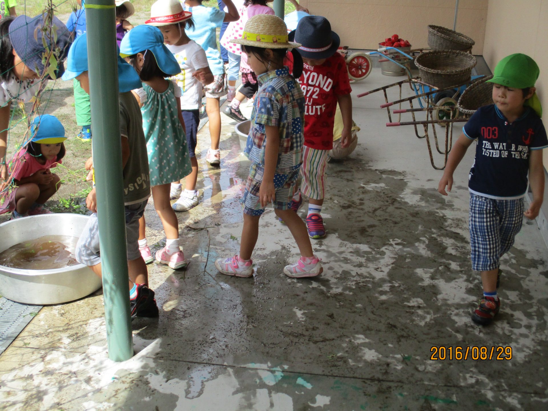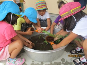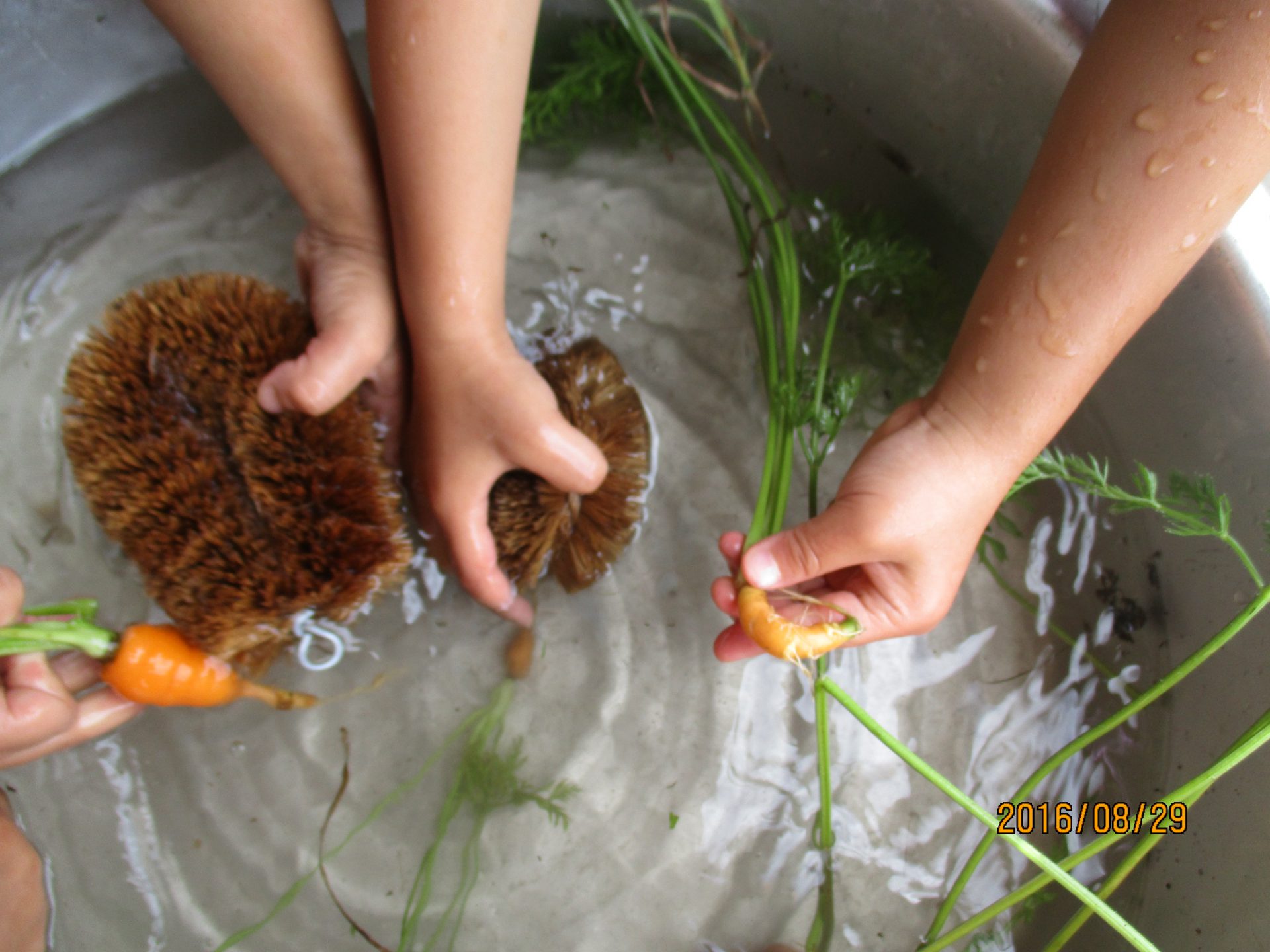 明日のカレーに使う事を伝えると、「きれいにしなきゃ」「どろんこのにんじんは嫌だもんね」と一生懸命洗う子ども達。