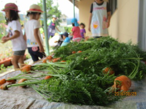 「僕の大きいよ!」「足みたいのある。」「あかちゃんにんじんかわいいな。」ニンジンチームは、大きいものから小さいものまで様々な形のにんじんを友達と見せ合いながら、楽しんでいました。