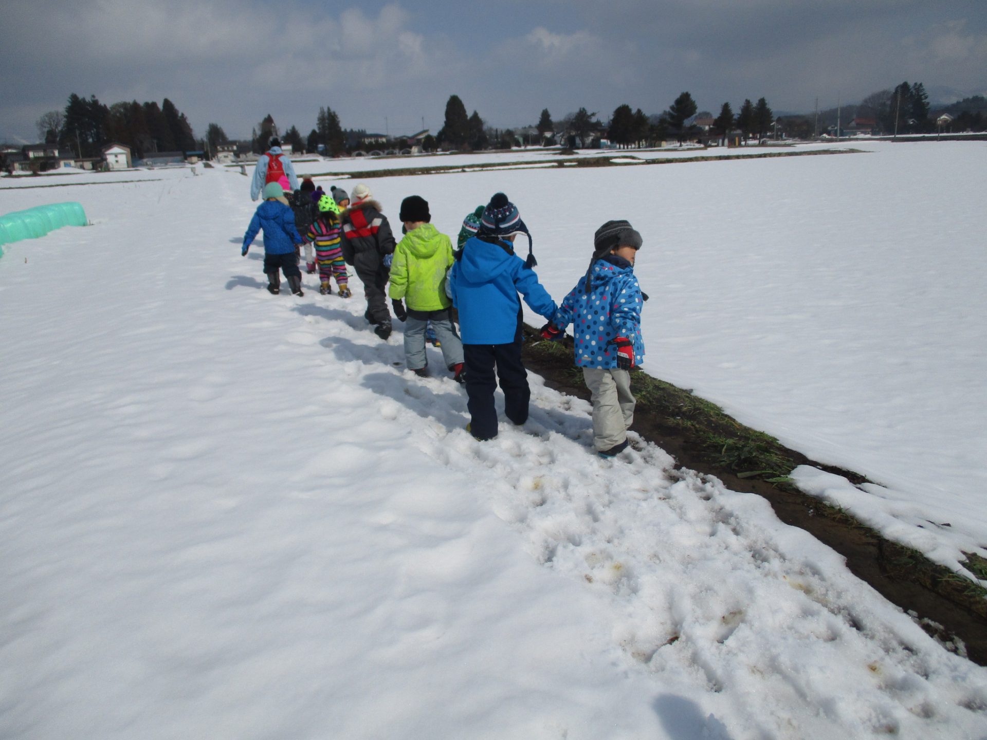 今年は雪の量が少なく、園庭の遊具も姿を現しています。