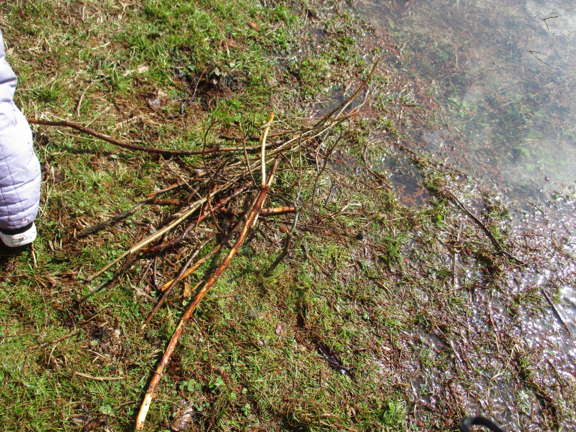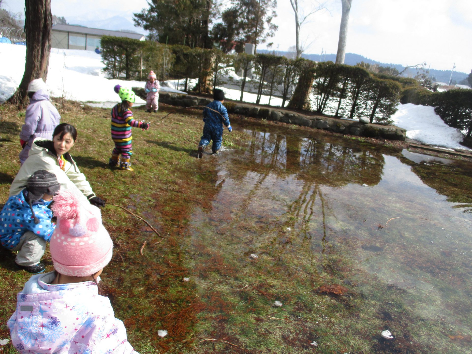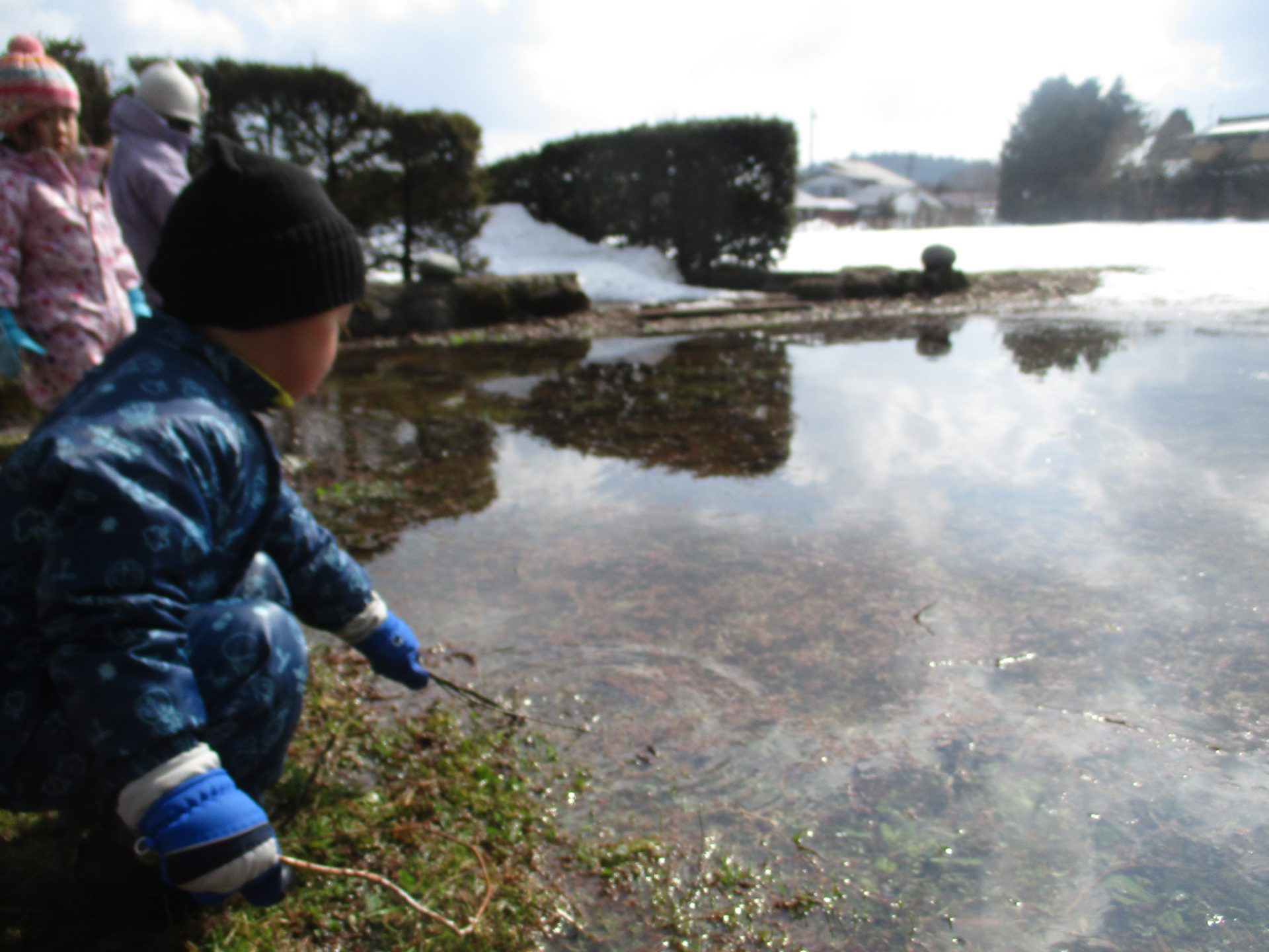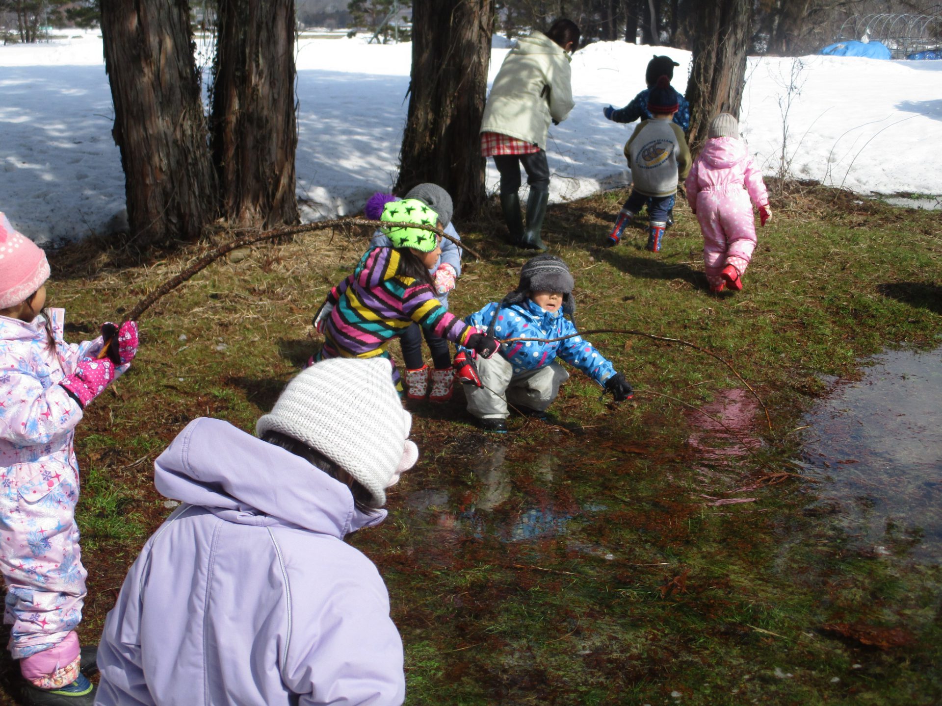 雪溶け水でできた大きな水たまりで魚つりごっこが始まりました。