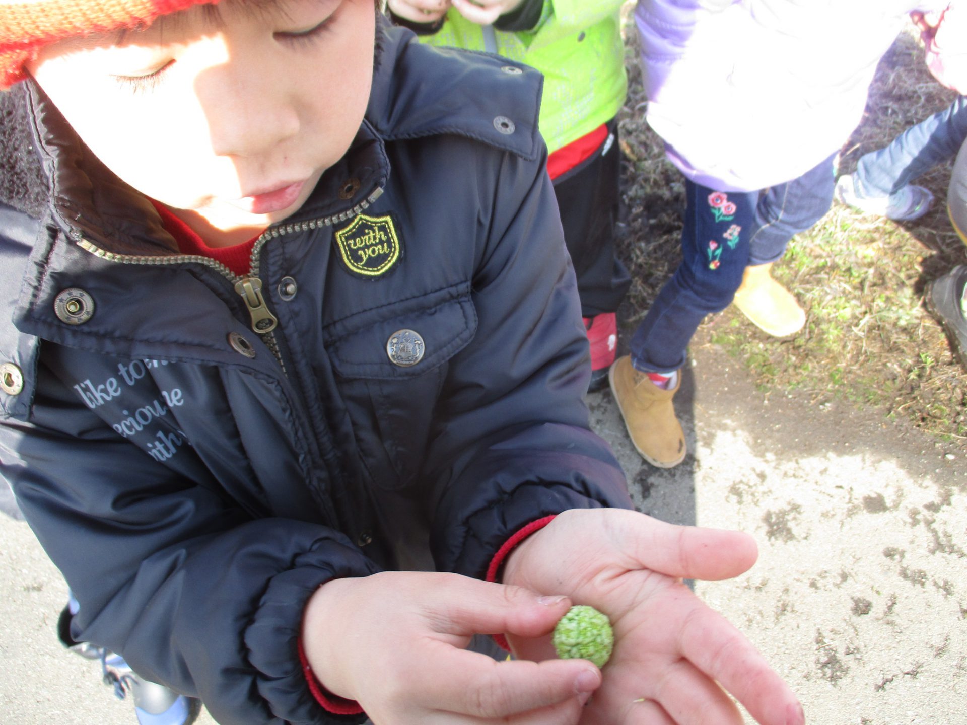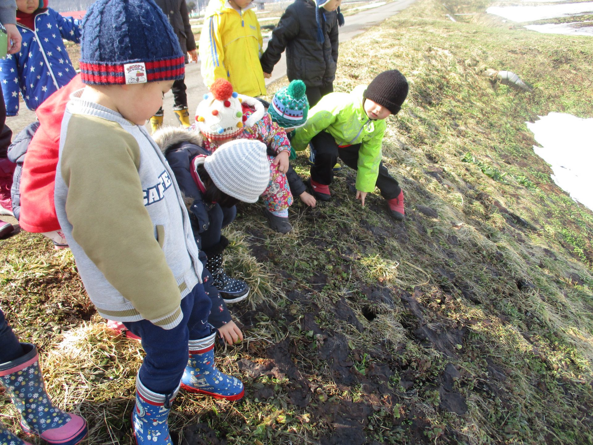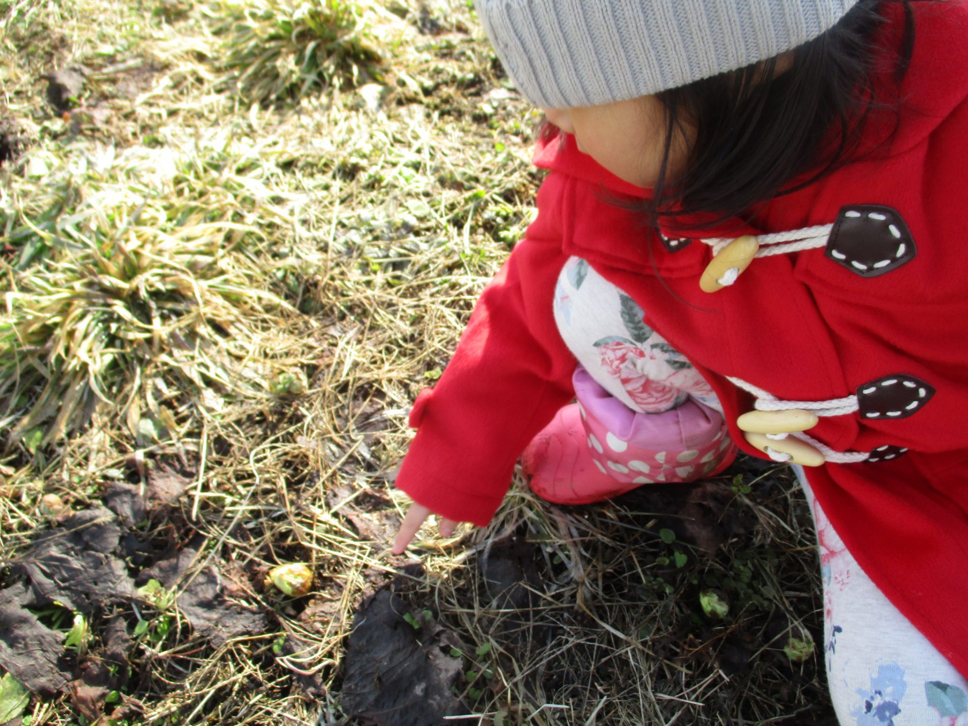 暖かい日が続き、あちこちで春の訪れを感じるようになりました。子ども達も、直接声に出さなくても季節の移り変わりや春の訪れを子ども達なりに感じているようでした。これからも天気の良い日には散歩に出かけて春探しを楽しみたいと思います。