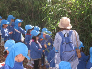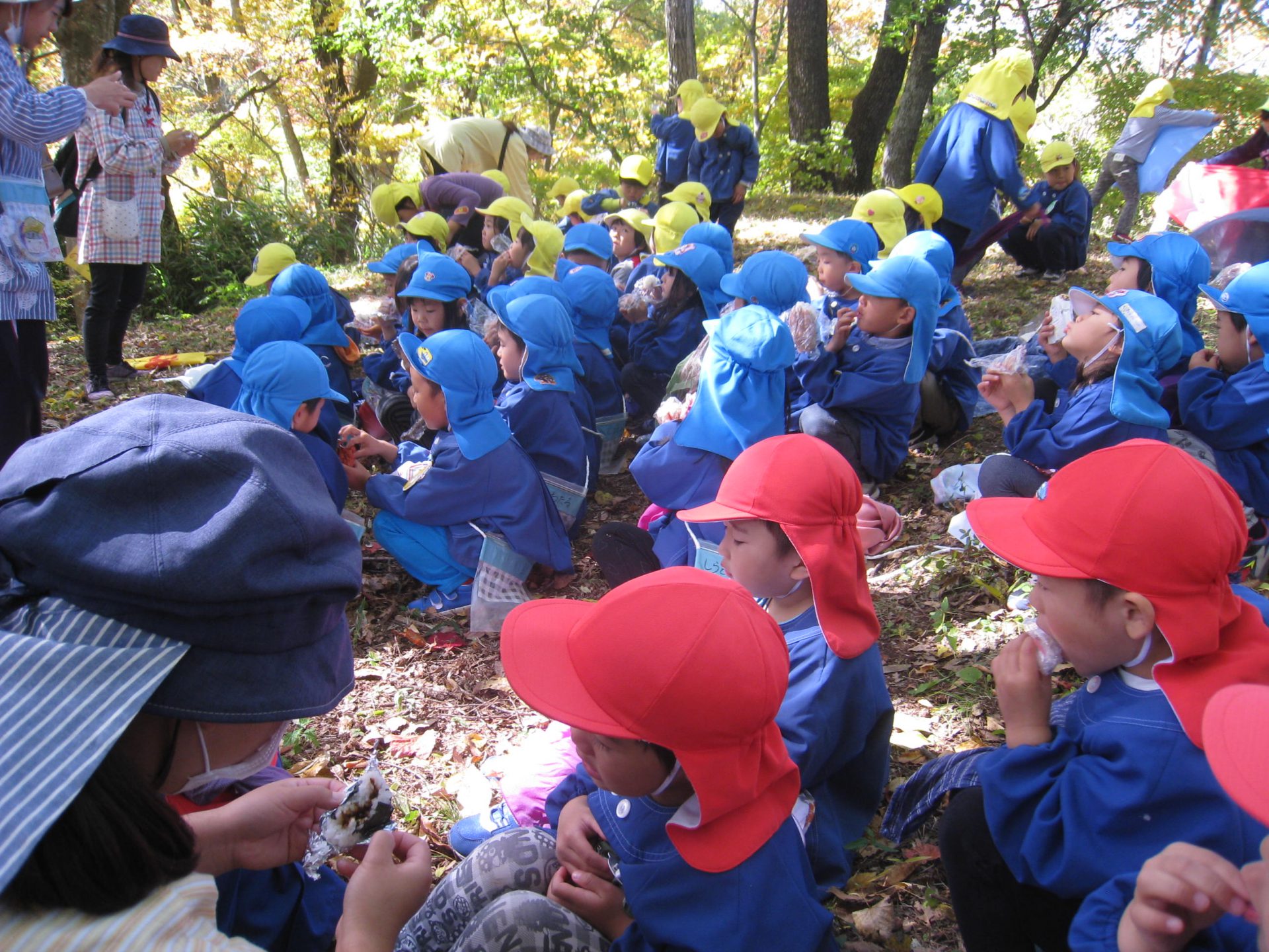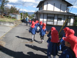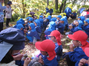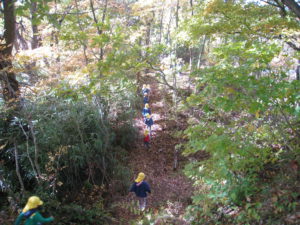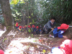 秋の親子城山修行を待たずに城山に登った三歳児。保育士や年長・年中児と一緒にたくましく登ることができた。