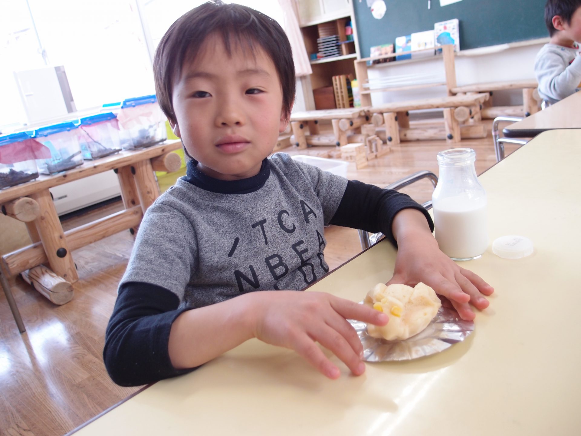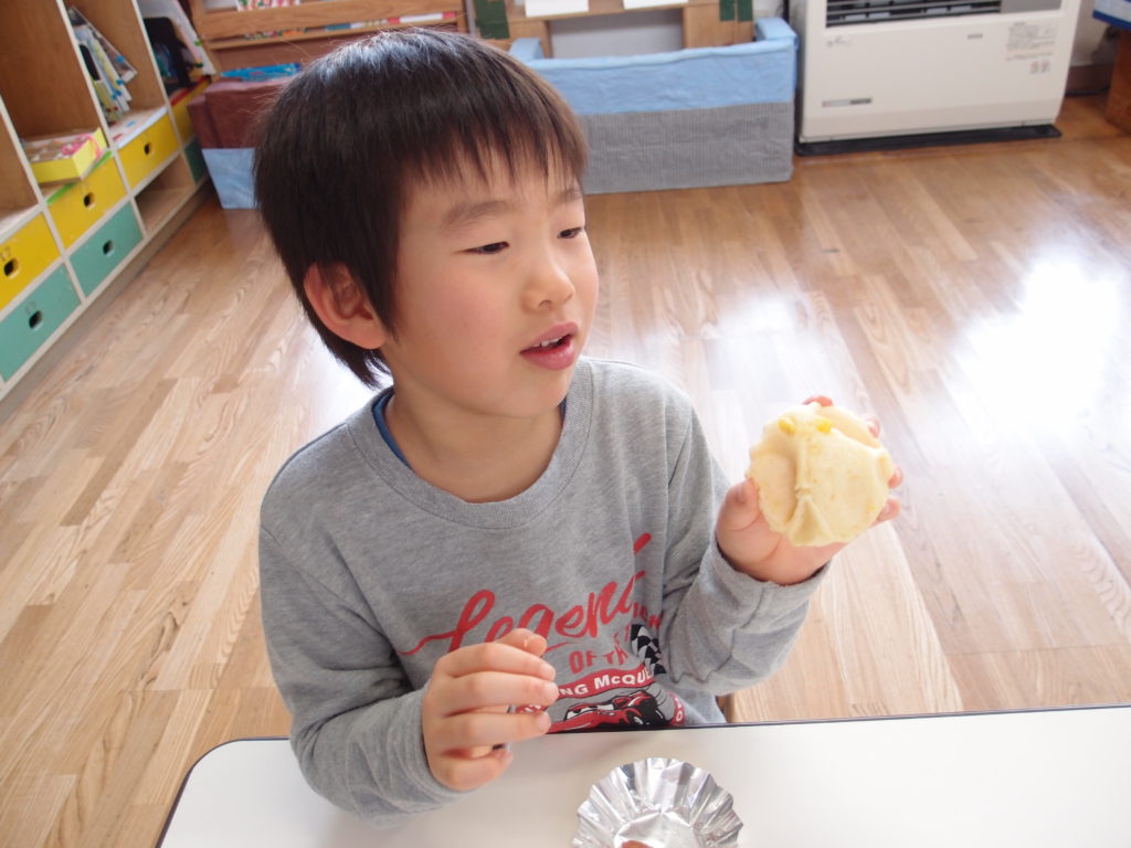 年中さんはおやつのナウマンゾウ蒸しパンを見て、