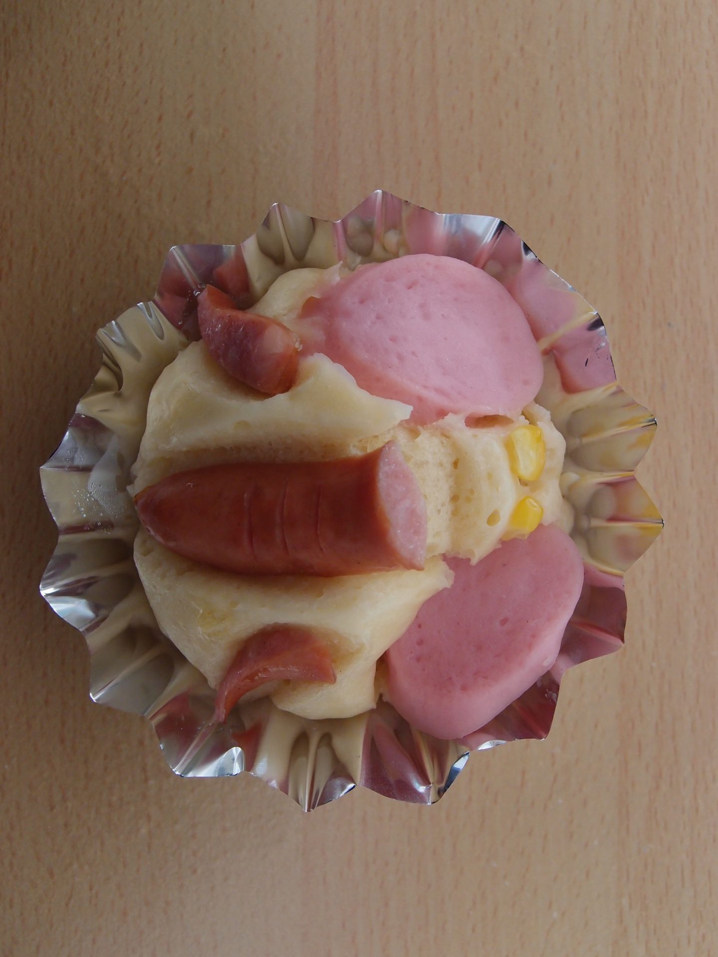 魚肉ソーセージが耳、ウィンナーの鼻、ウィンナーの牙、目がコーンです。