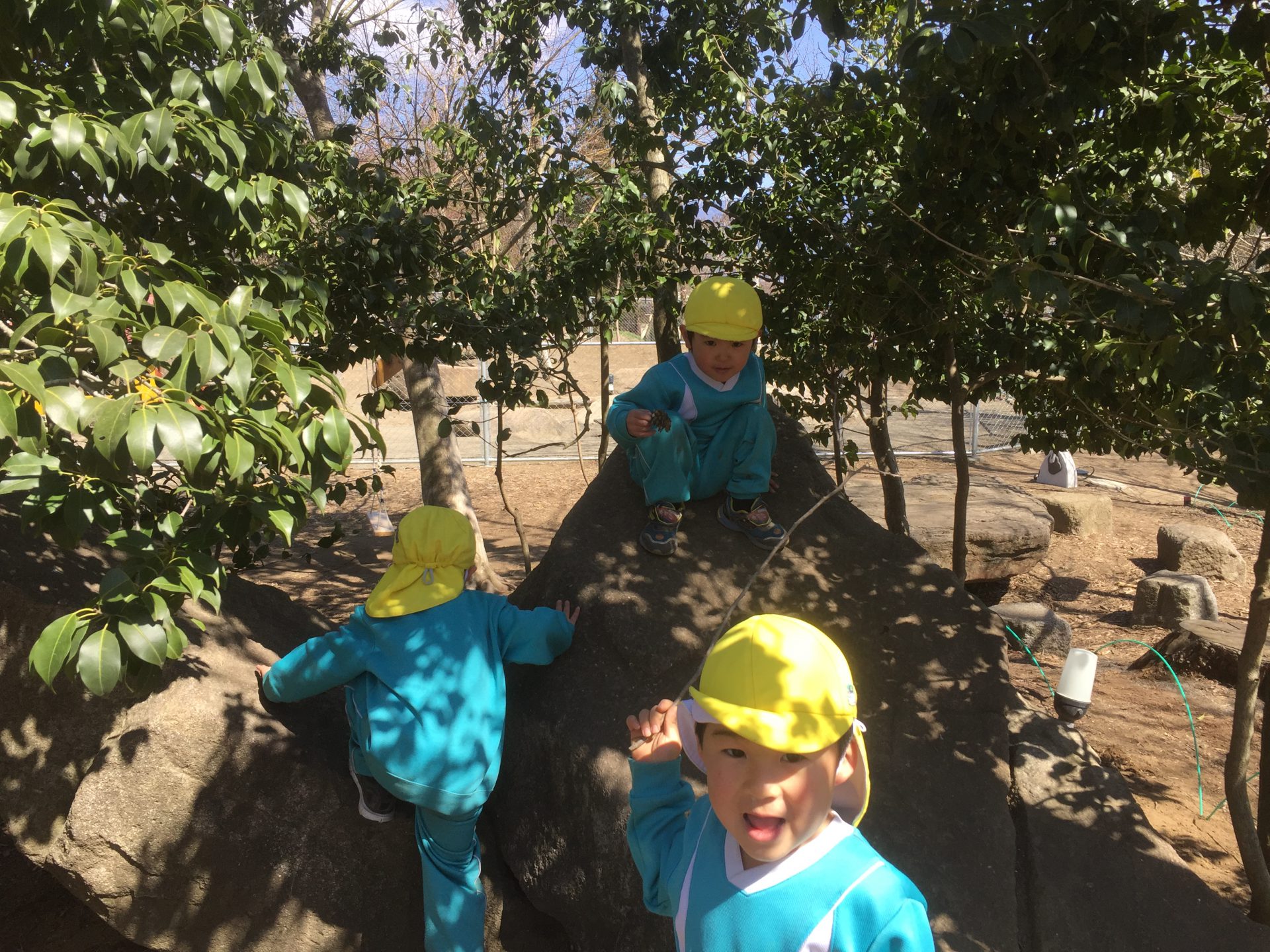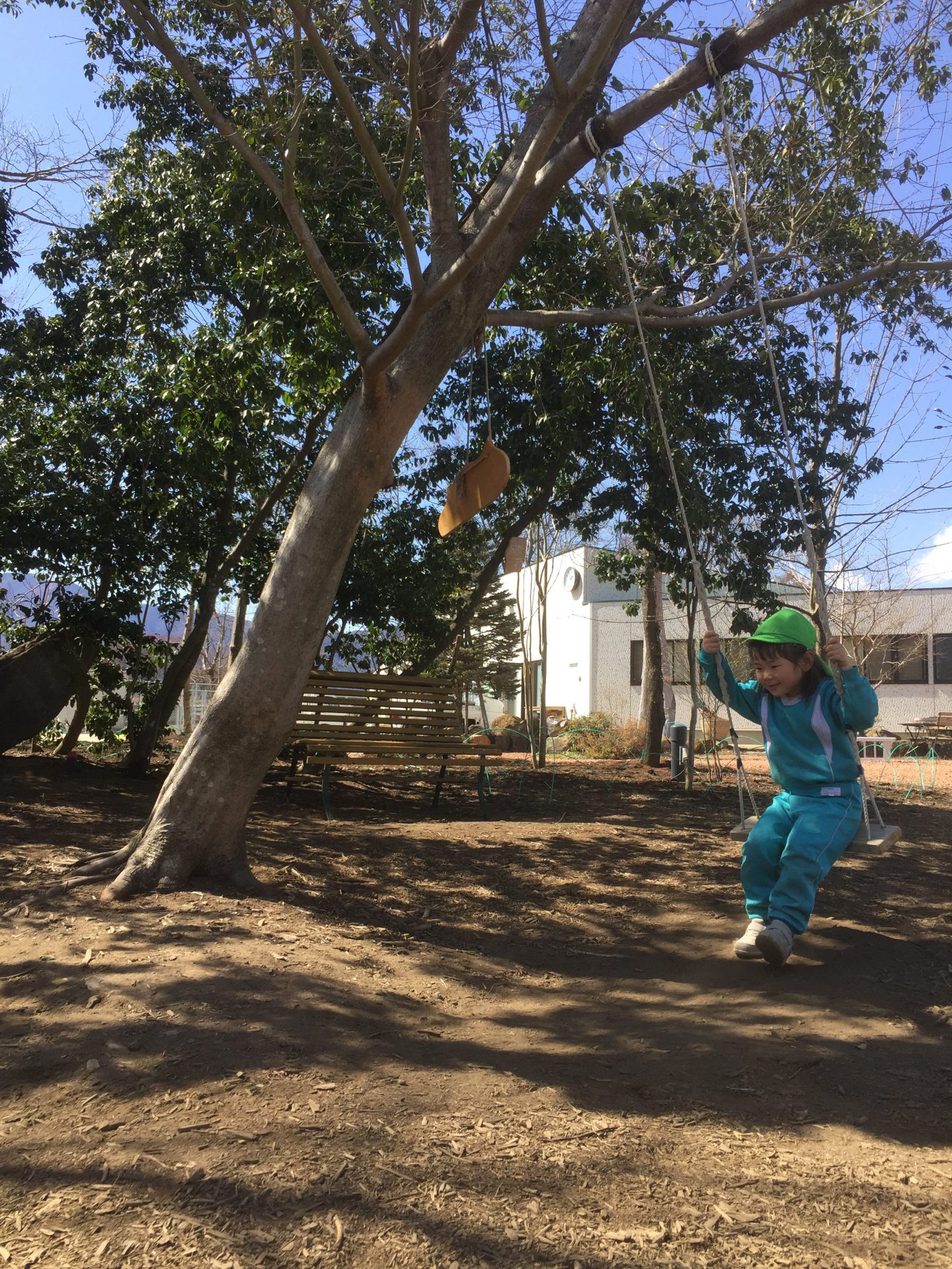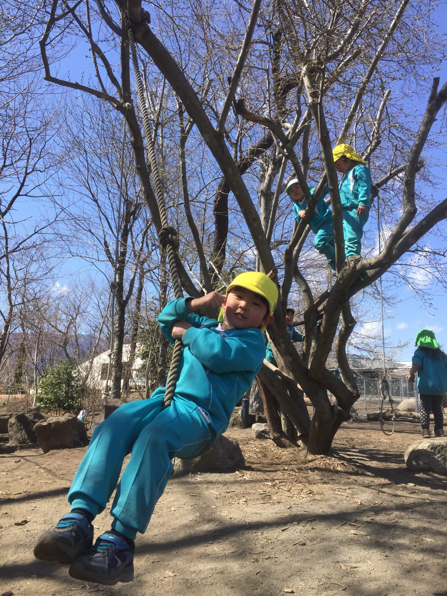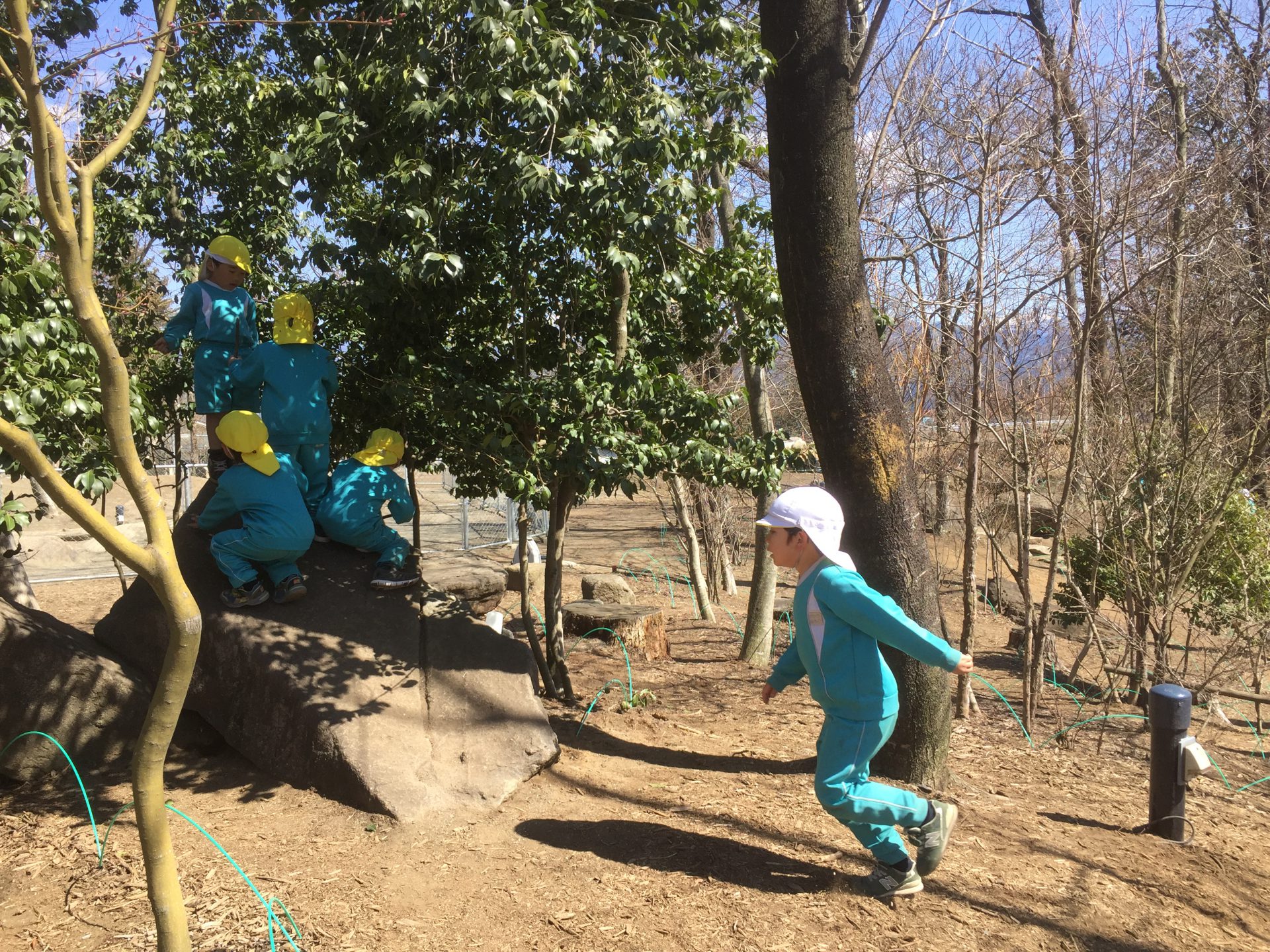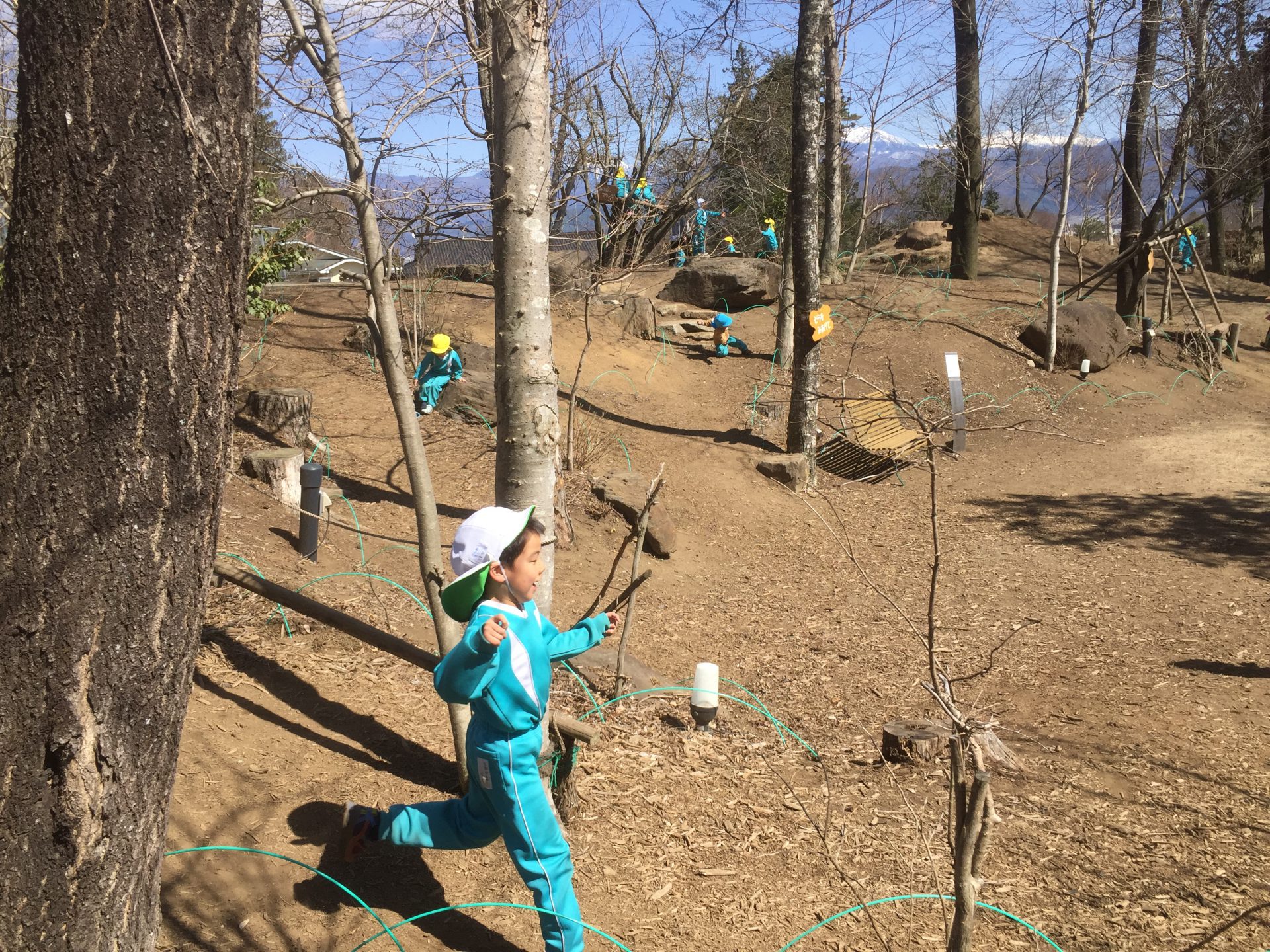 園内にある森のフィールドに出て、友達と鬼ごっこや氷鬼をしたり、木登りに挑戦したりと自分のやってみたい遊びを体いっぱい使って楽しむ。