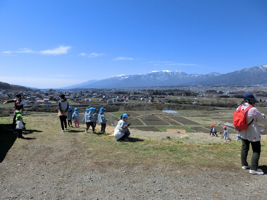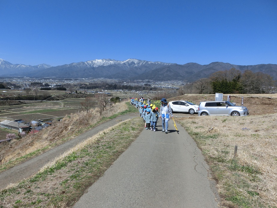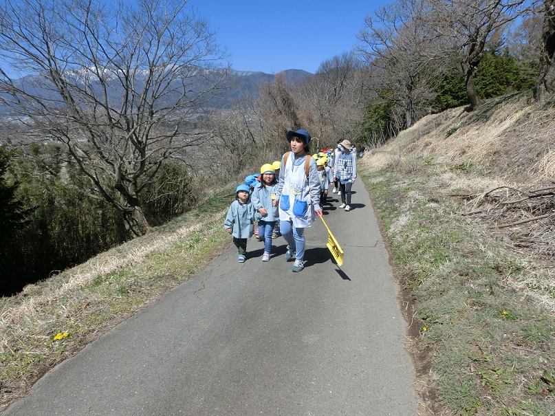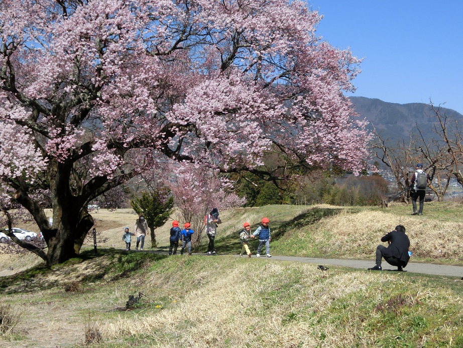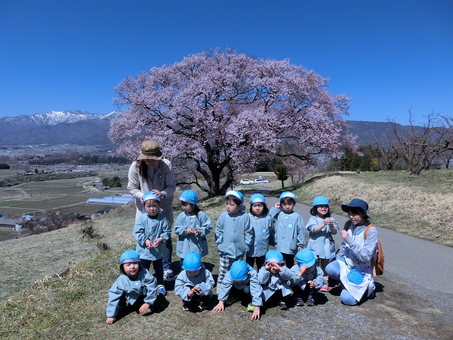 東みのわ保育園では長野県の史跡「上ノ平城址」にある1本桜にお花見散歩に出掛けています。お花見散歩は年少が散歩デビューの日となりますが今年は2歳児も行ってみます。3歳以上児より早く出発です。