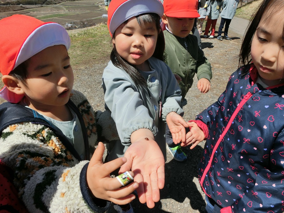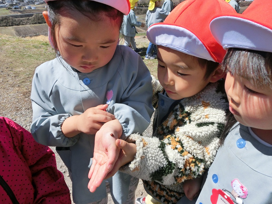 てんとう虫を見つけると「私も触らせて」「僕も持ってみたい」と興味津々でした。てんとう虫からさらに色々な物に興味関心が出てくるといいなと思いました。