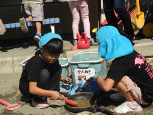 自由遊びの時間に、砂場でごちそう作りをする
