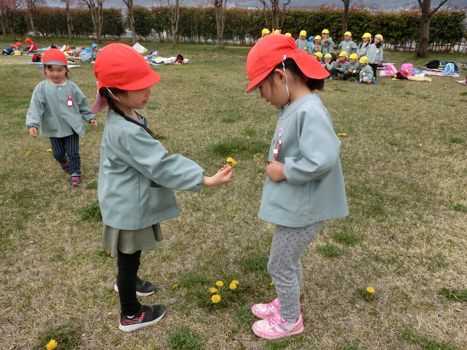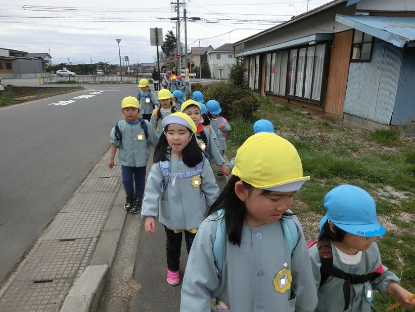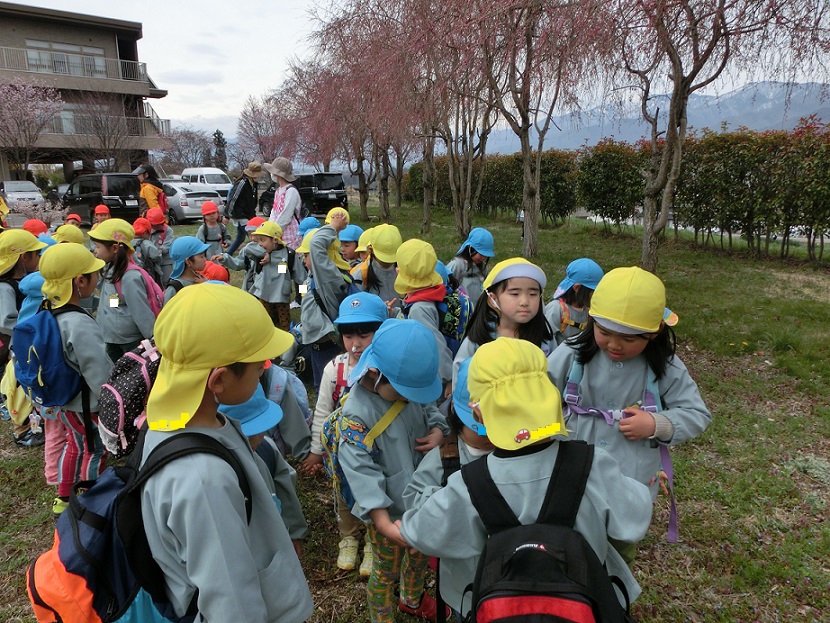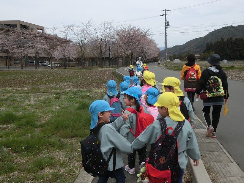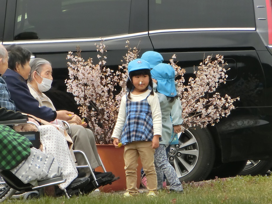 桜の花が咲くと東みのわ保育園近くにある介護老人保健施設の「わかな」さんにお花見給食に出掛けます。異年齢で手を繋いで出発!