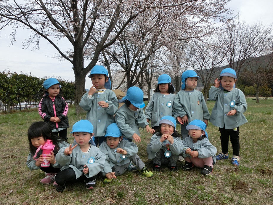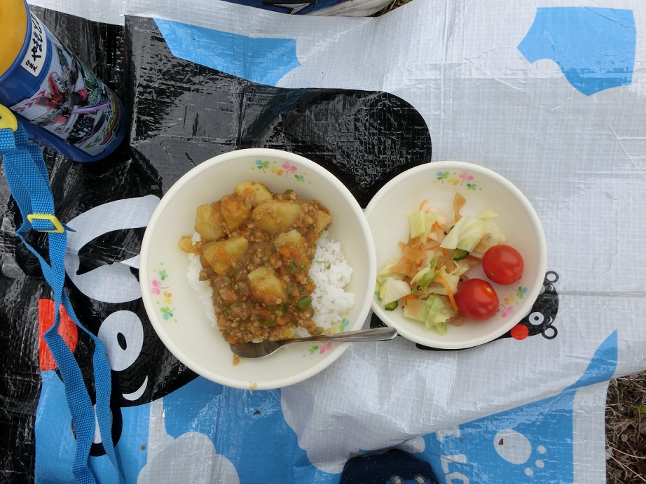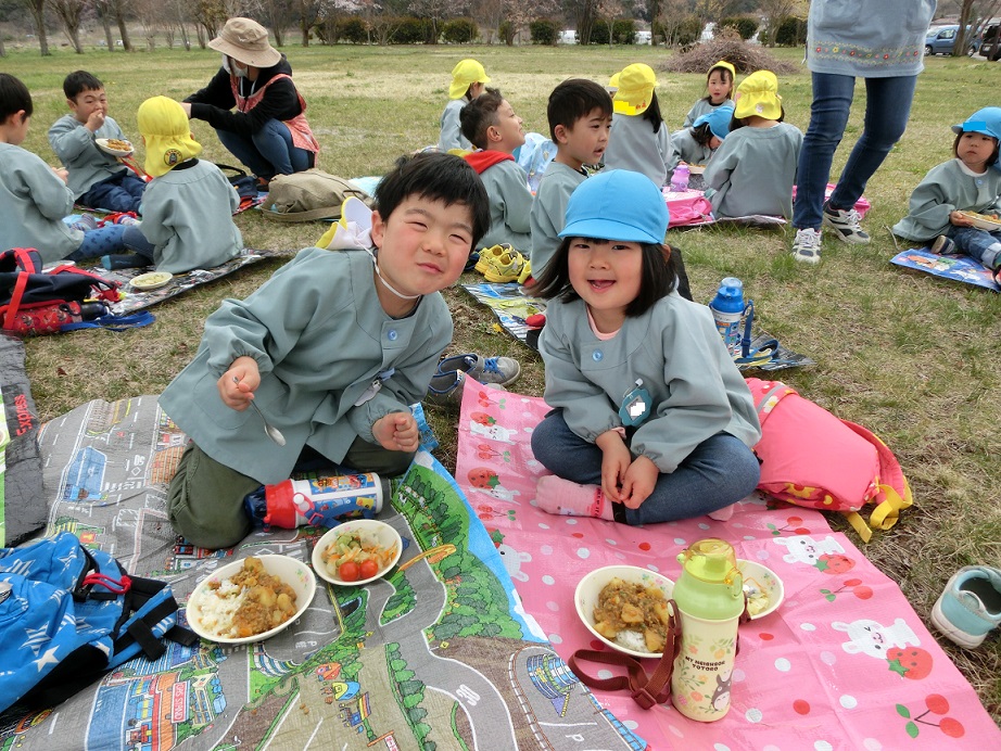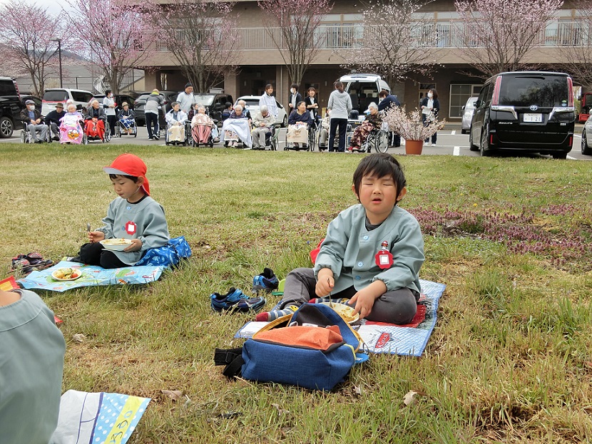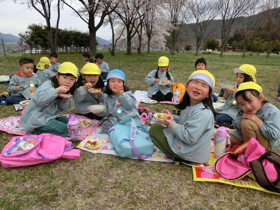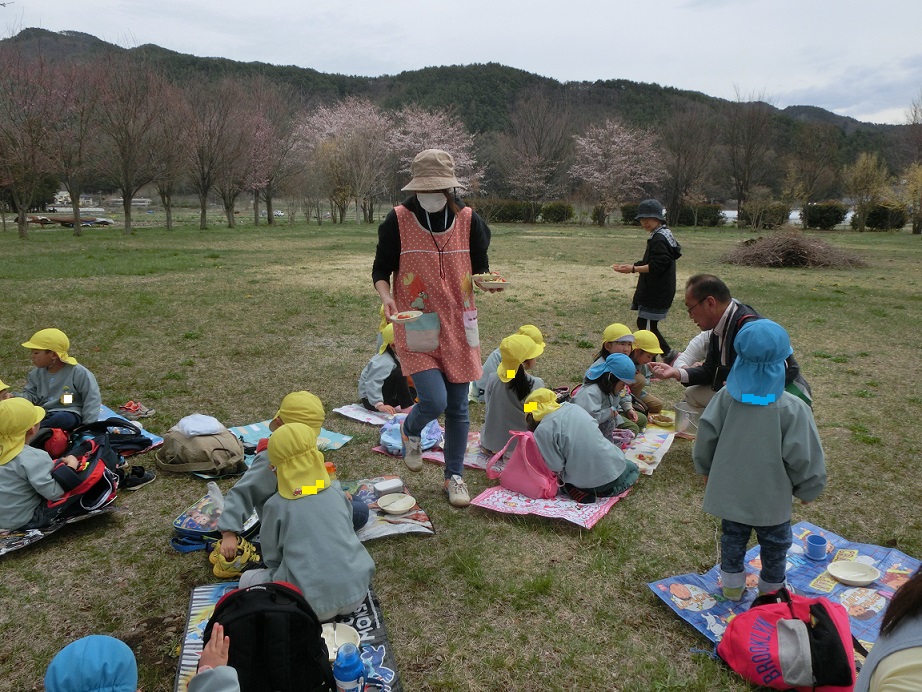 桜の花の下でのお花見給食、どの子も大喜びでよかったと思いました。