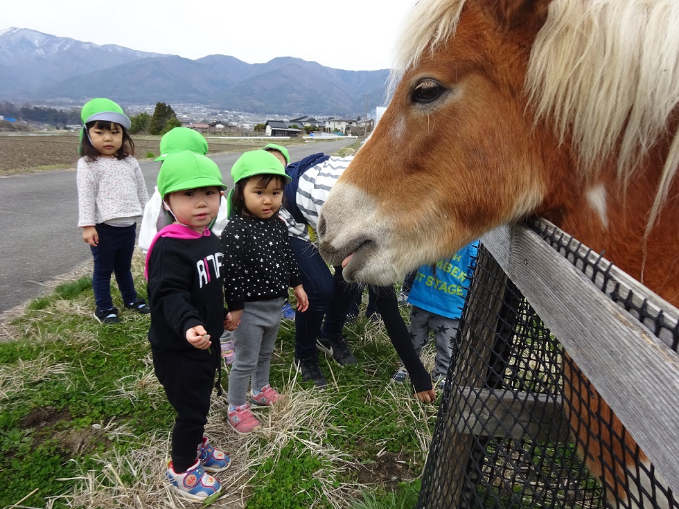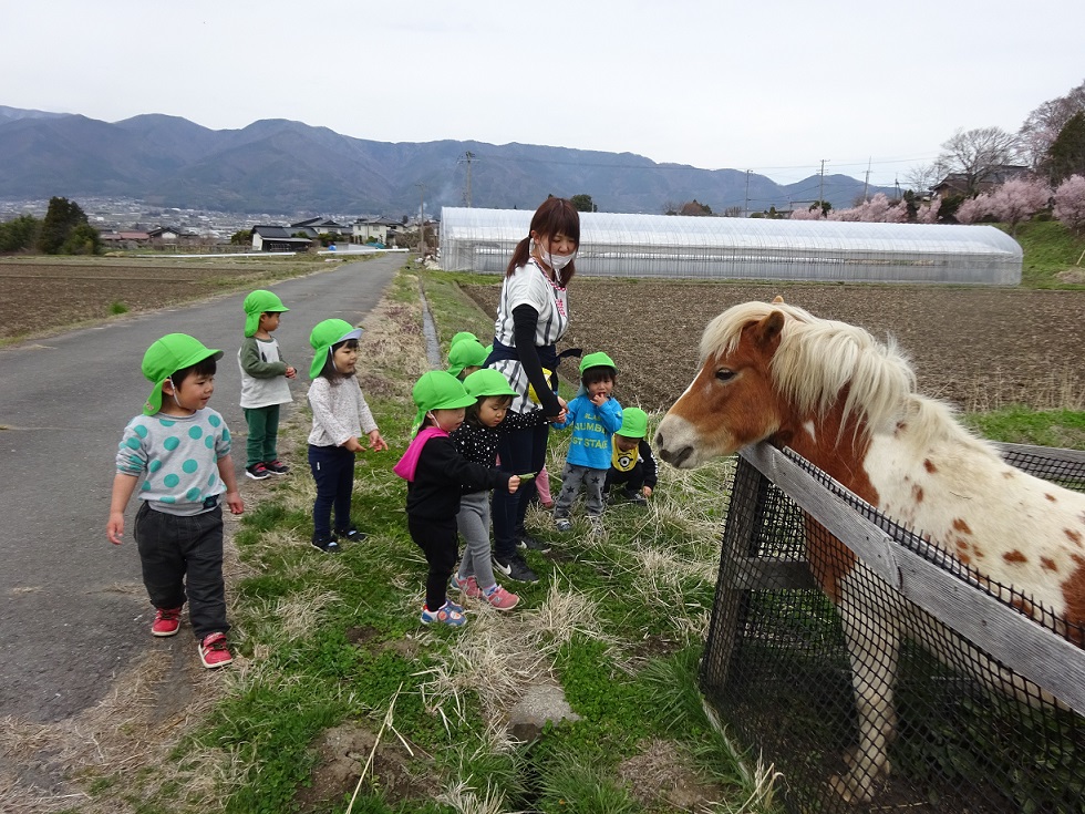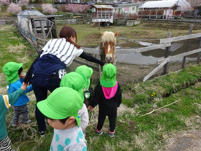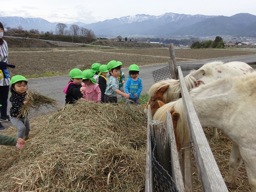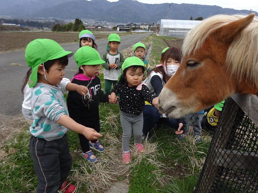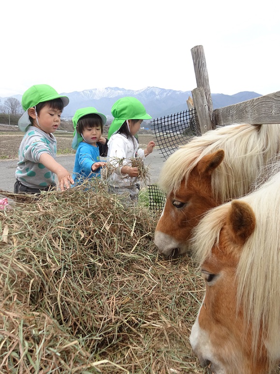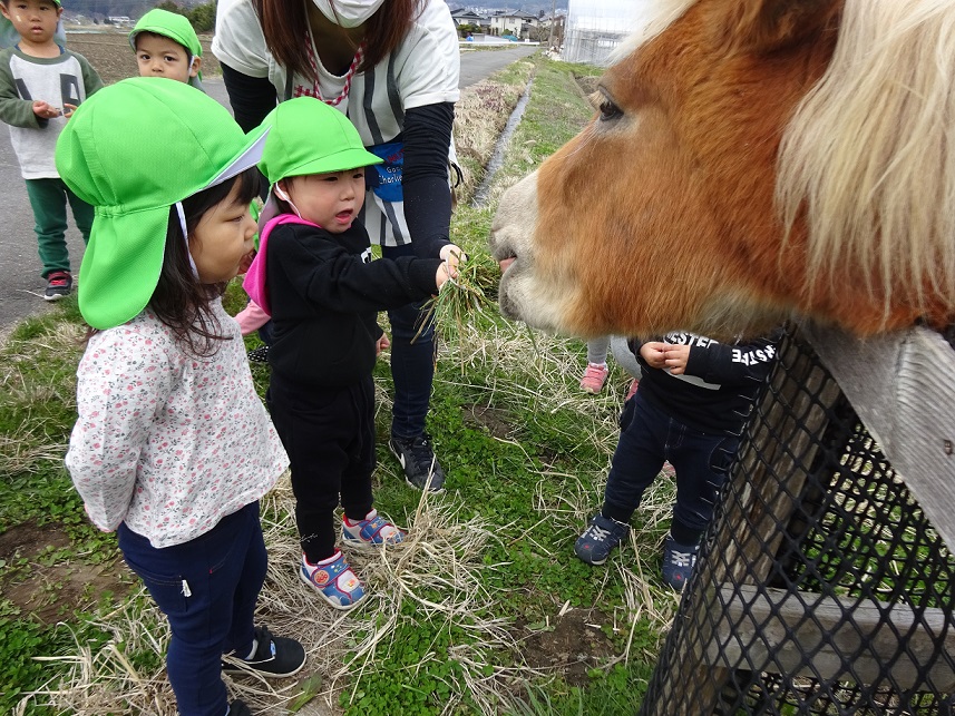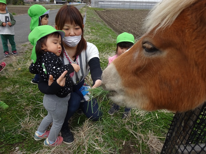 保育士と一緒にポニーに草をやってみます。(飼い主さんの許可はいただいています)
