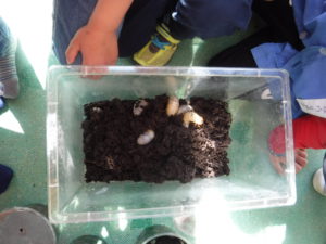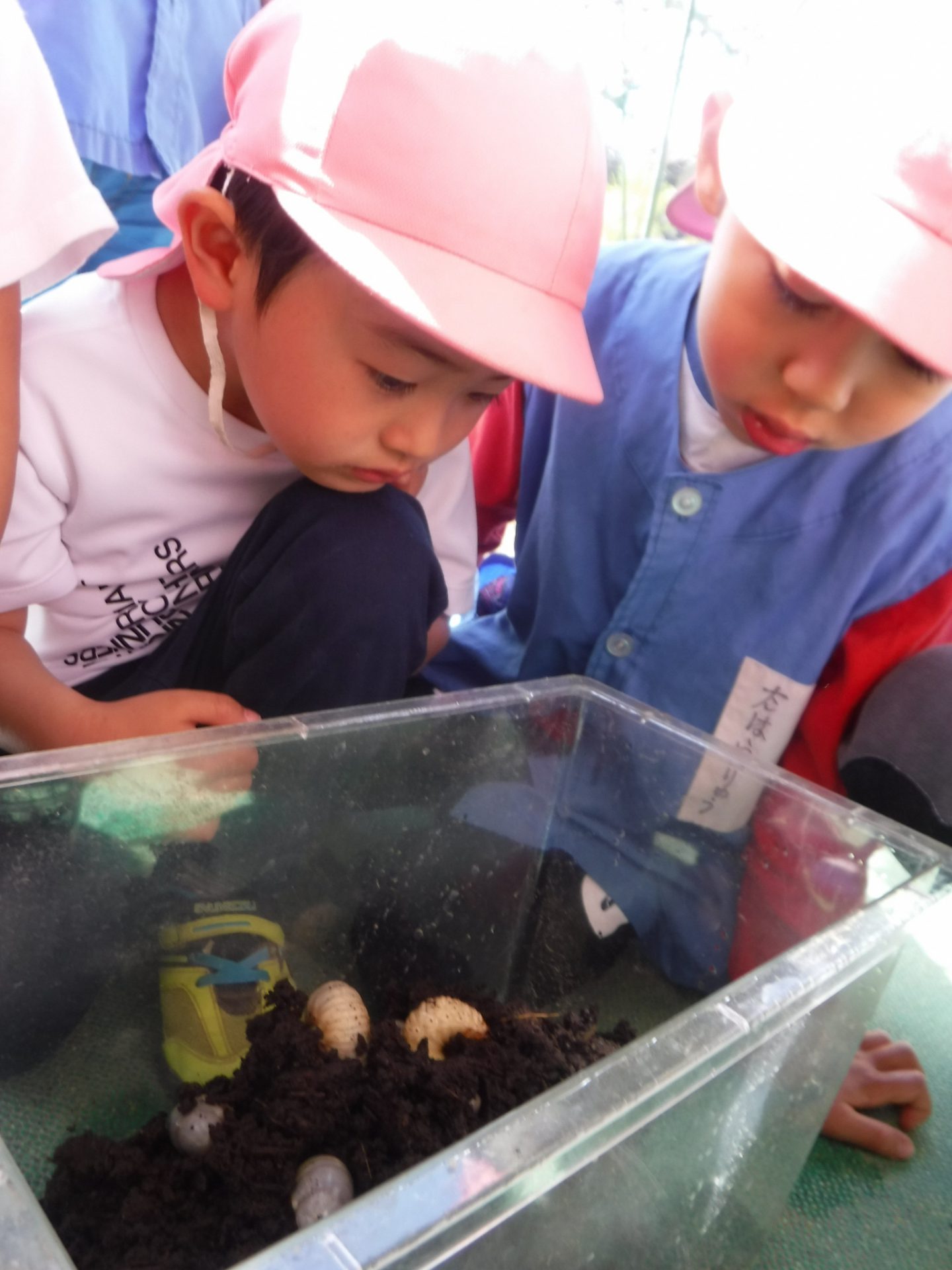 年長児の男の子が家からカブトムシの幼虫を持ってきました。