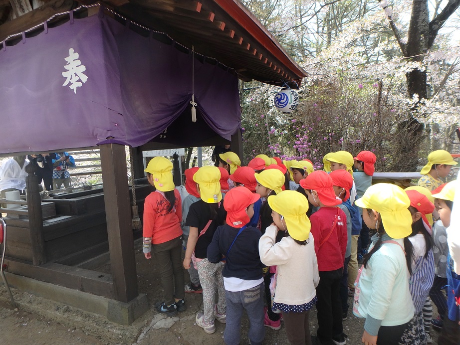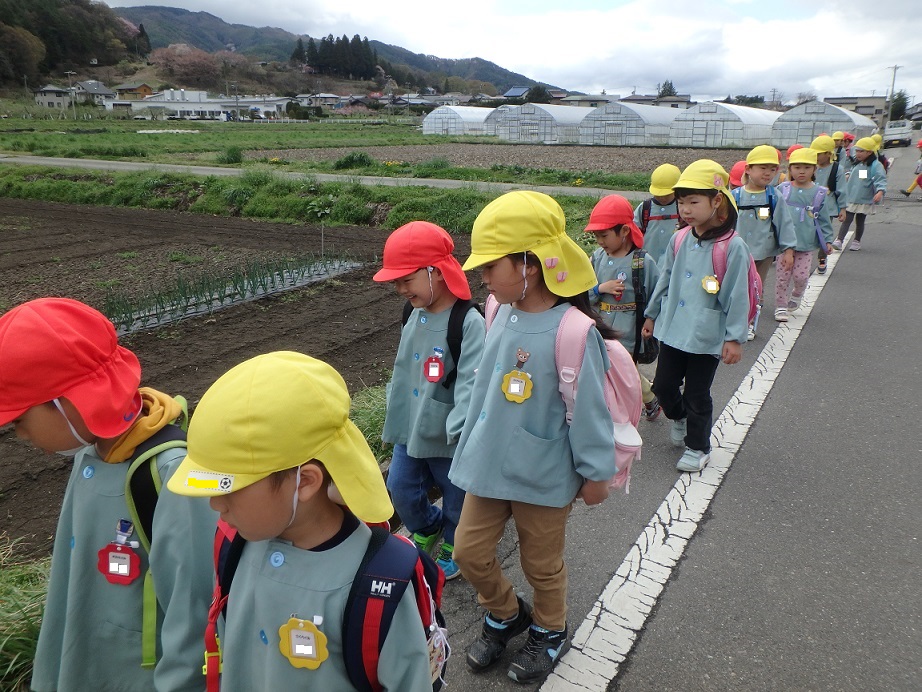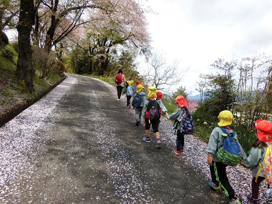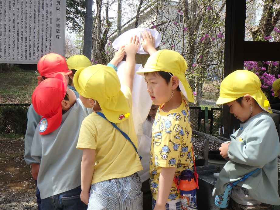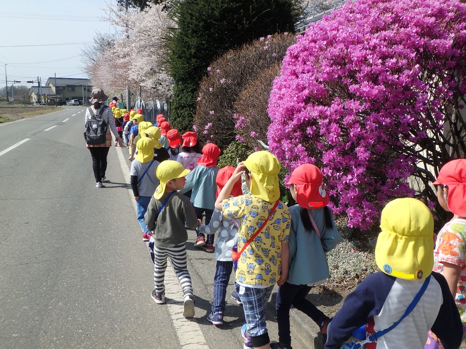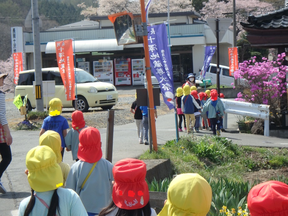 4月24日は長岡地区にある十澤地蔵尊の大祭。保育園は保存会の方と打ち合わせをして宵祭りの23日に参加させてもらいました。十澤地蔵尊に向かって出発です。箕輪町の花「イワヤマツツジ」がきれいに咲いています。