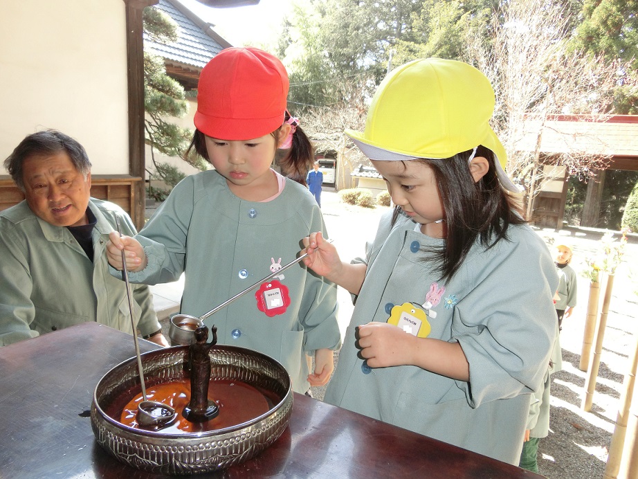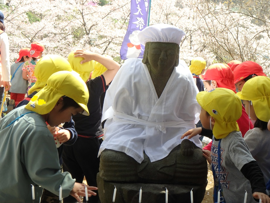 お釈迦様が生まれた時に甘い雨が降ったという言い伝えでお釈迦様の像に甘茶を掛けます。