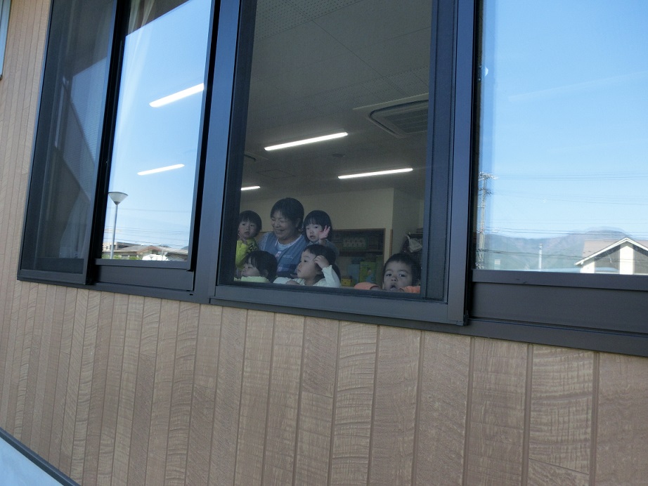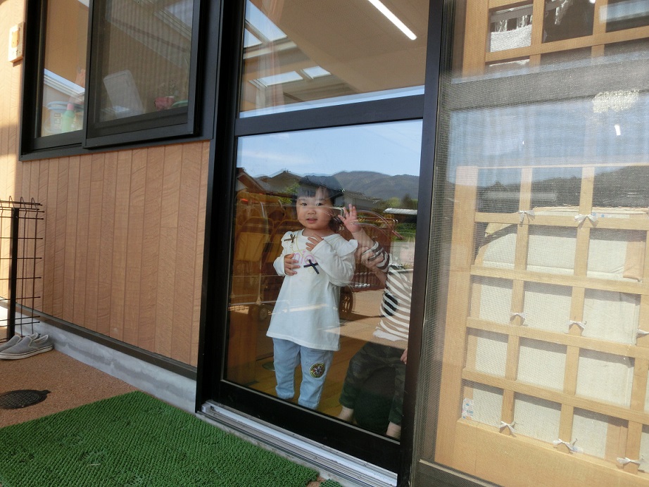 1歳児「うさぎ組」が保育室から見送ってくれます。