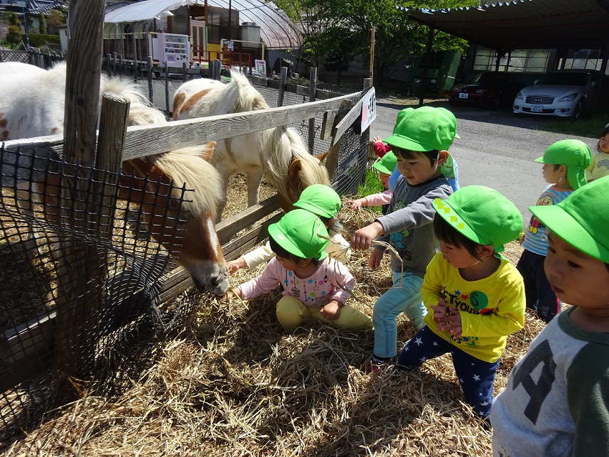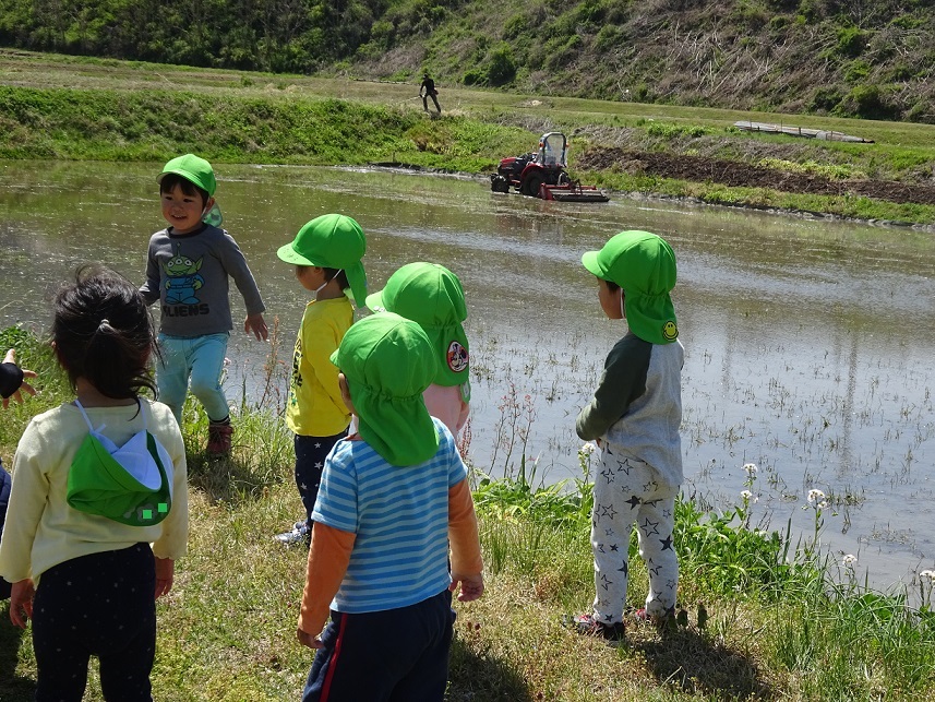 田んぼで仕事しているところや周りを興味深く見ながらポニーの所に向かいます。