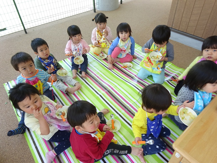 今日は遠足気分でテラスにシートを広げて昼食を摂りました。いつもより食べが良かったです。