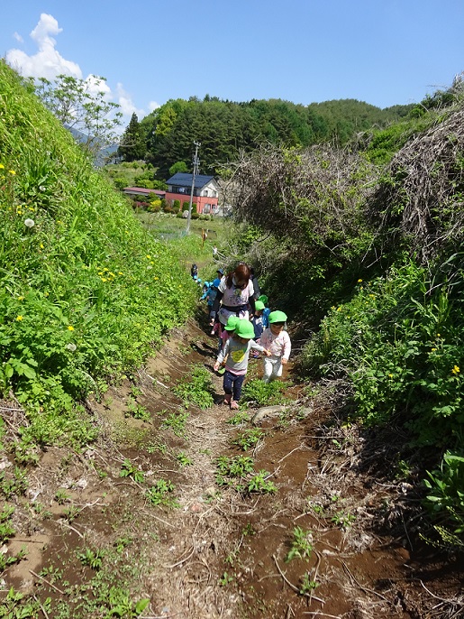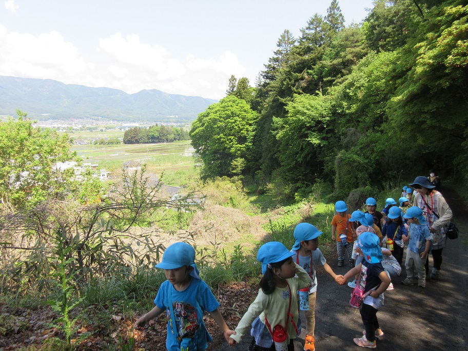 2歳児「こあら組」と年少児が上ノ平に向けて散歩に出掛けました。いつもとは違う道を行きます。