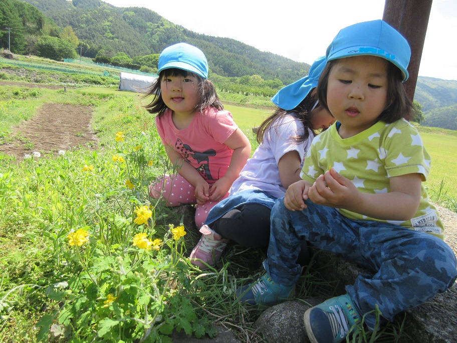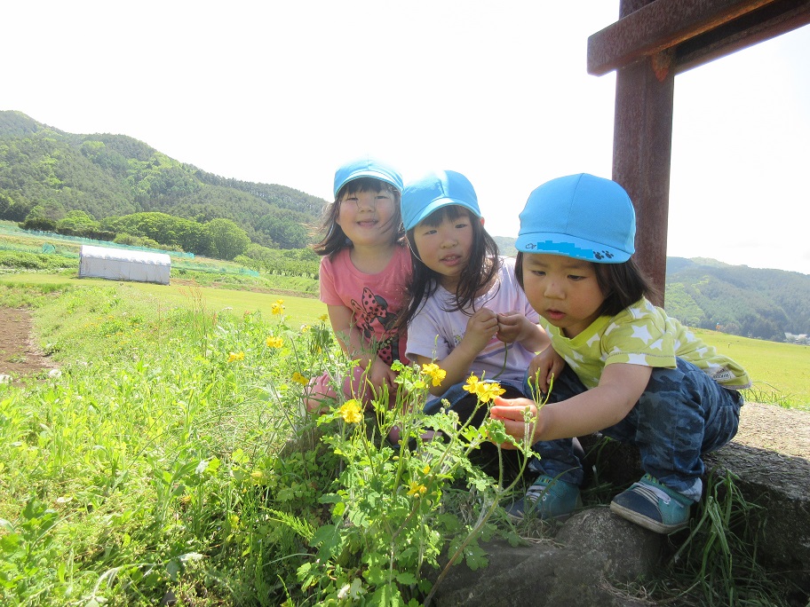 黄色い花に興味を持った子ども達。保育園に帰ったら一緒に調べてみようと思いました。