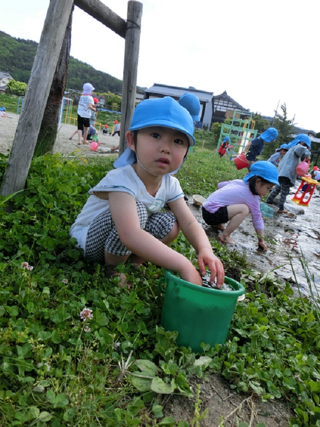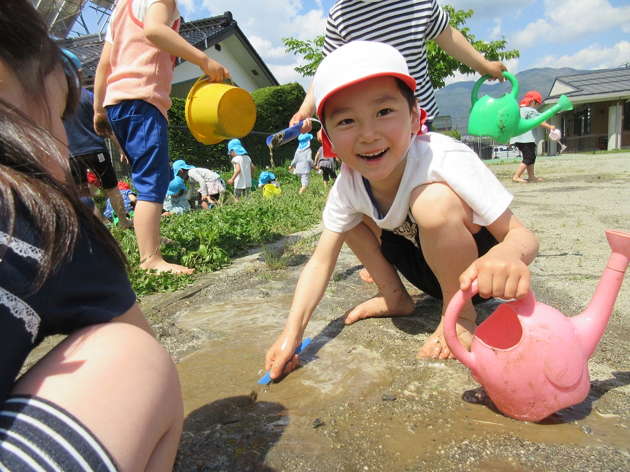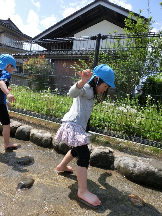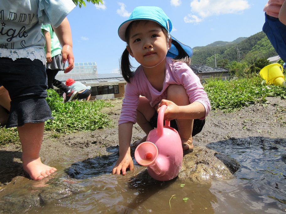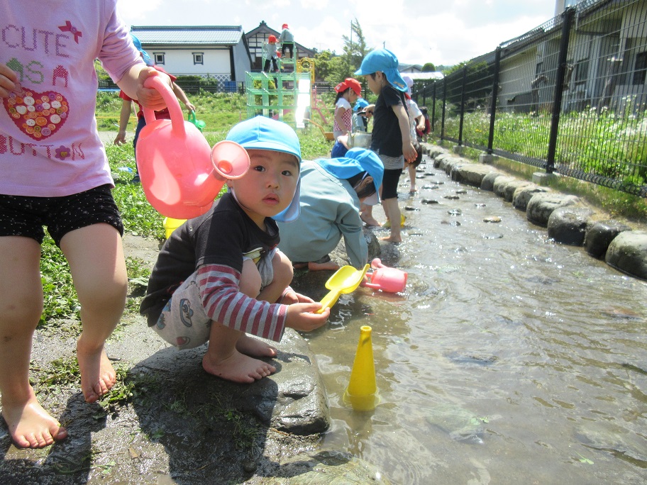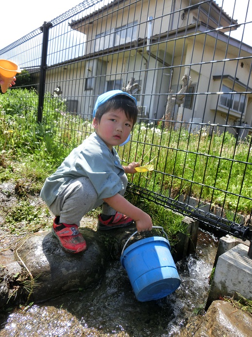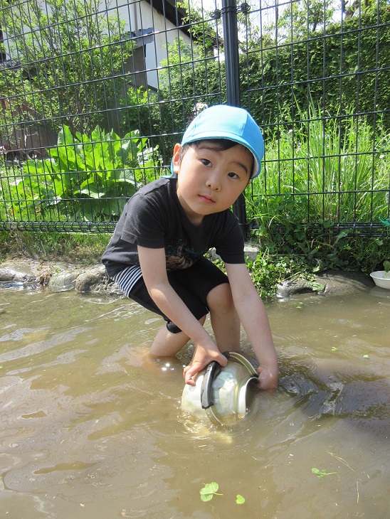 東みのわ保育園では陽気が良くなってくると通称「ビオトープ」に水が入ります。今年度は10連休明けから水が入りました。久しぶりのビオトープを楽しみます。