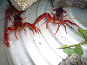 3歳児のいちご組で飼っているザリガニ達。現在5匹になりました。2本のはさみでミミズをつかみ小さなはさみで上手に食べています。わくわく広場にミミズを捕まえに行くのも子ども達の日課です。