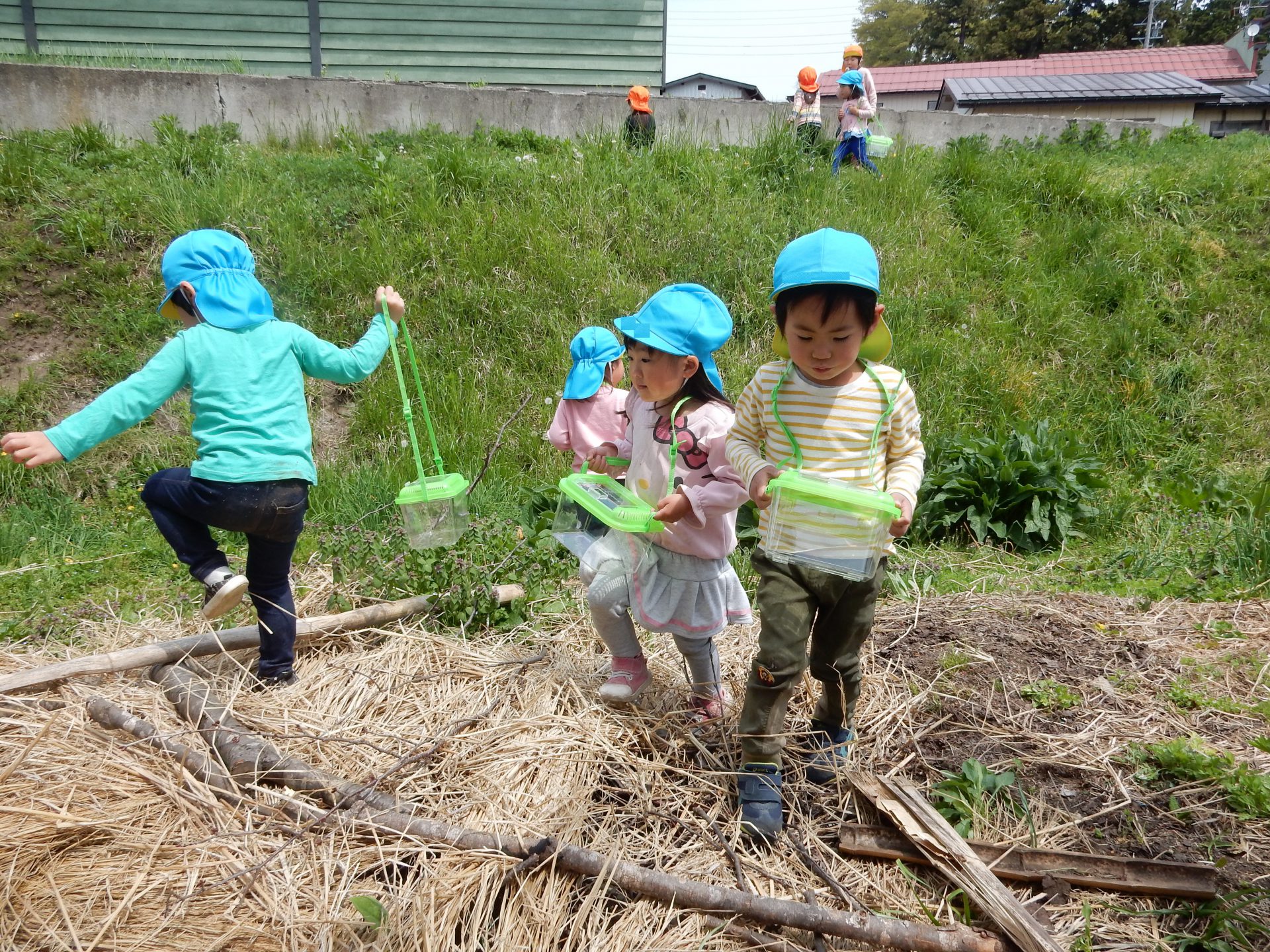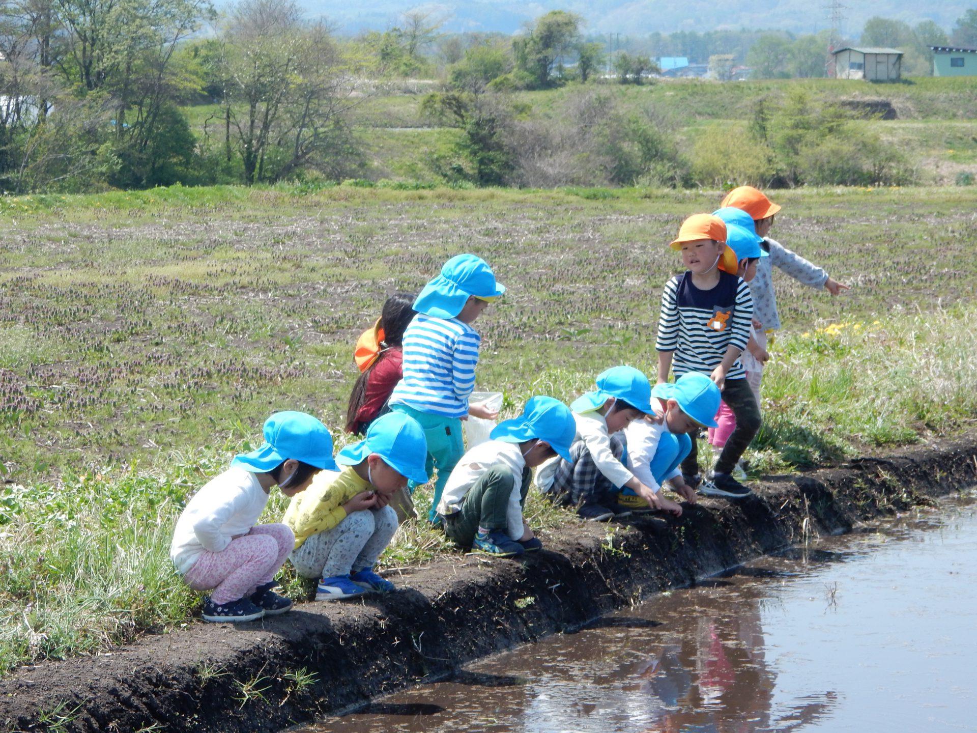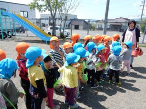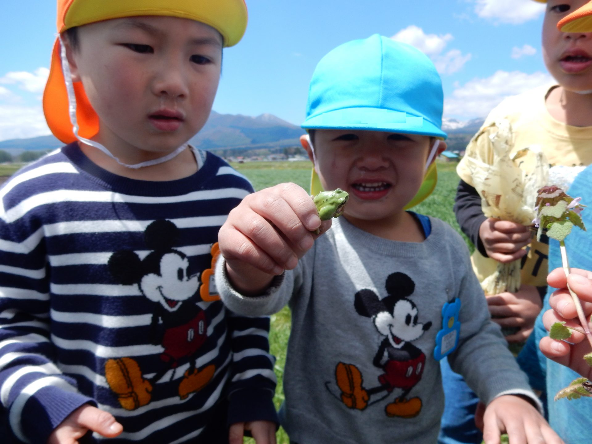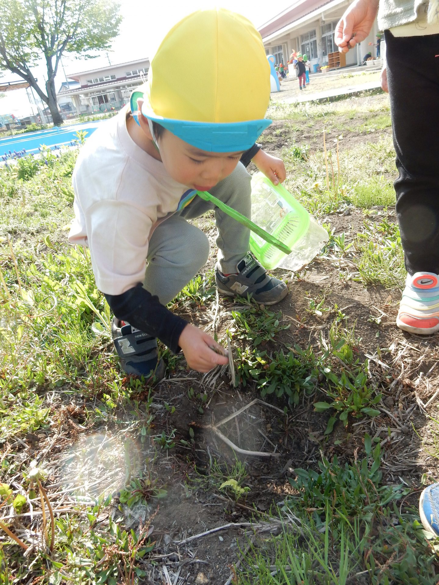 今年は4月の中旬頃になっても園庭に雪が残っていて、なかなか園庭で遊べない日が続きました。その分、園外にお散歩に出かけて冬の雪解けや歩く道の草花・風・生き物などとの出会いから春の訪れを感じていました。