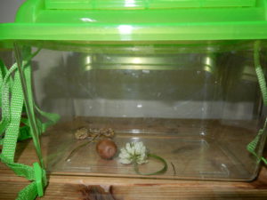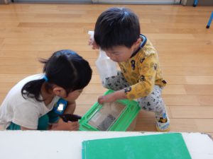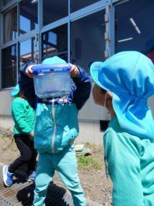 そこで子ども達が考えたのが、「年長さんのお部屋の前にある、ザリガニが入ってるみたいなのがほしい!」と年長さんが持っていた透明な飼育ケースを思いつきました。