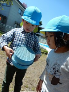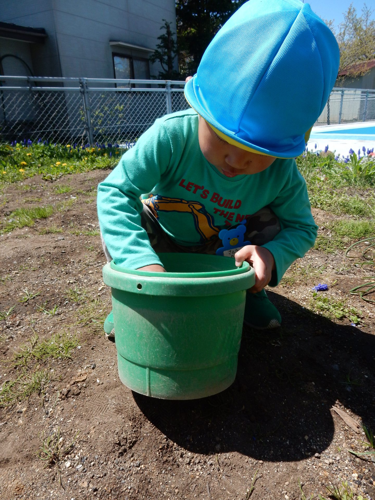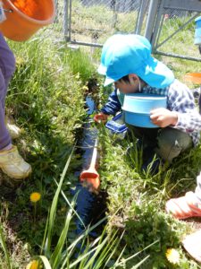 そこで、何かに入れておこうと、考えた子ども達。カエルが逃げないようにと、お砂場道具の中で1番底の深いバケツを見つけてきました。