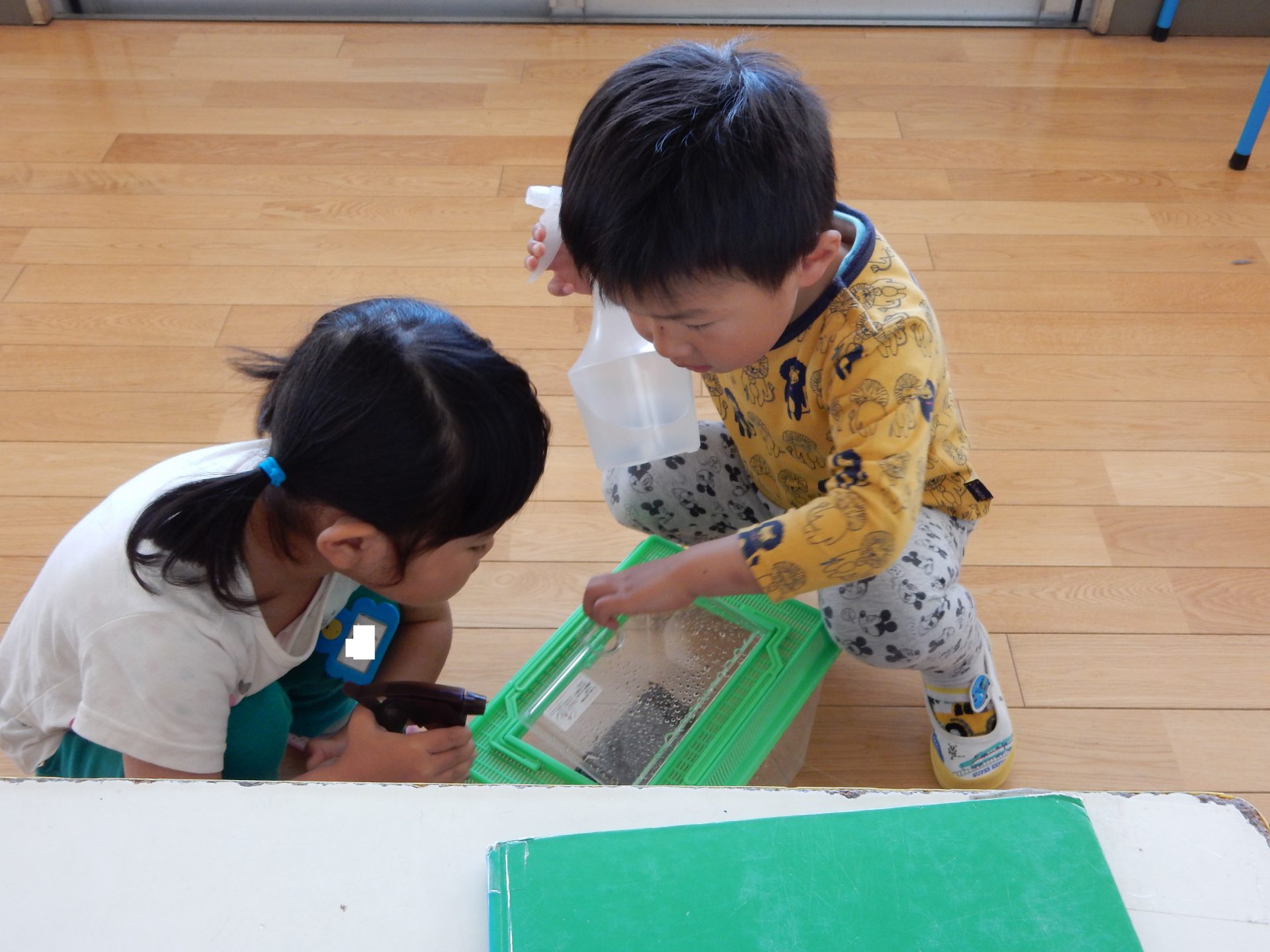 「カエルさんはお水が好きなんだよ。」と水を少し入れてあげたり、霧吹きで水をかけてあげる子。