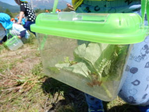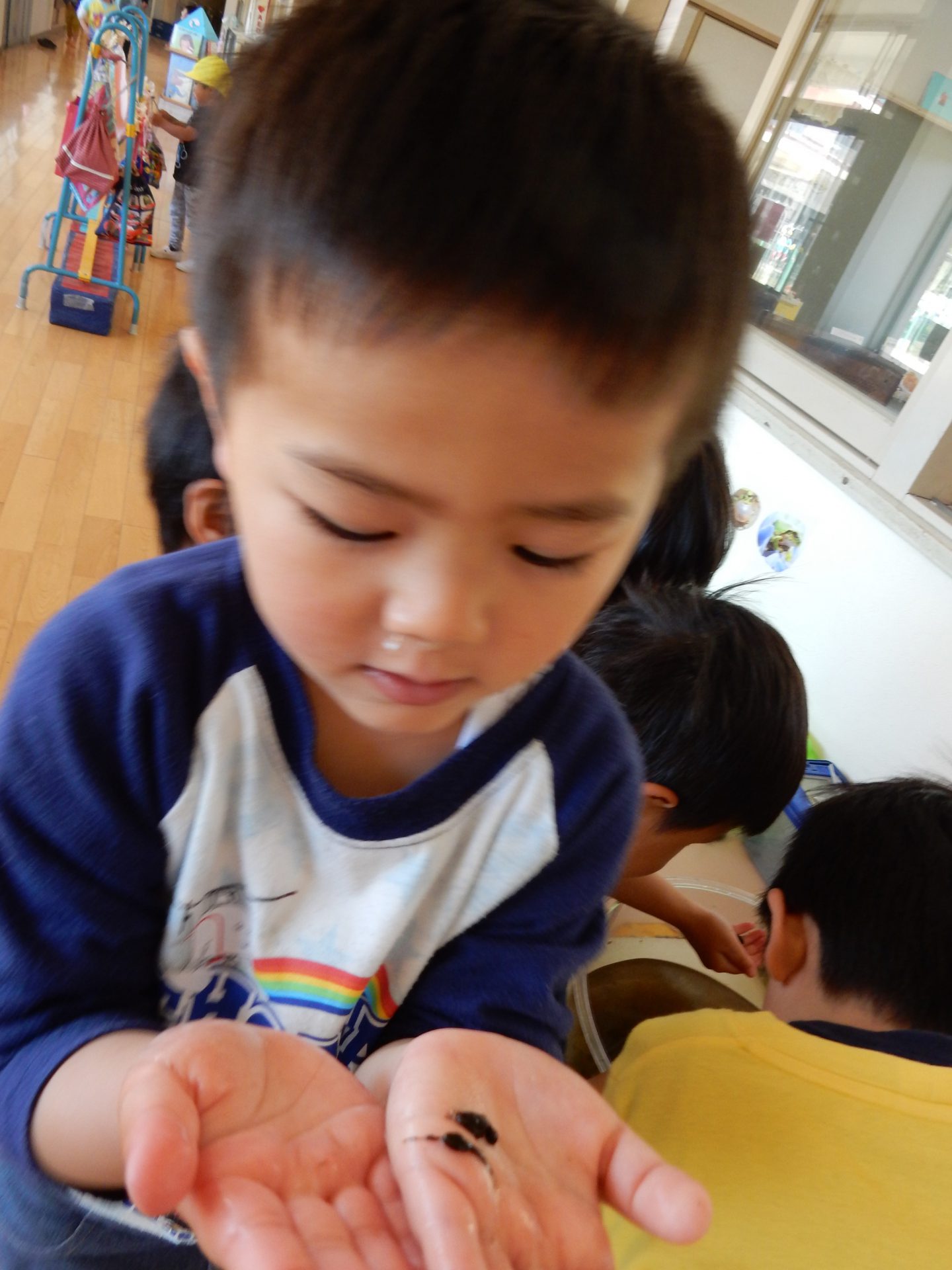 早速興味津々の子ども達。よーく見てみたくて、なんと手で捕まえては手のひらに乗せて観察。