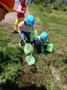 カエルを見つけると大喜びな子ども達。捕まえられる子はすぐに手でカエルを持ち、「捕まえたー‼︎」とお友達や保育士に自慢気に見せてくれました。