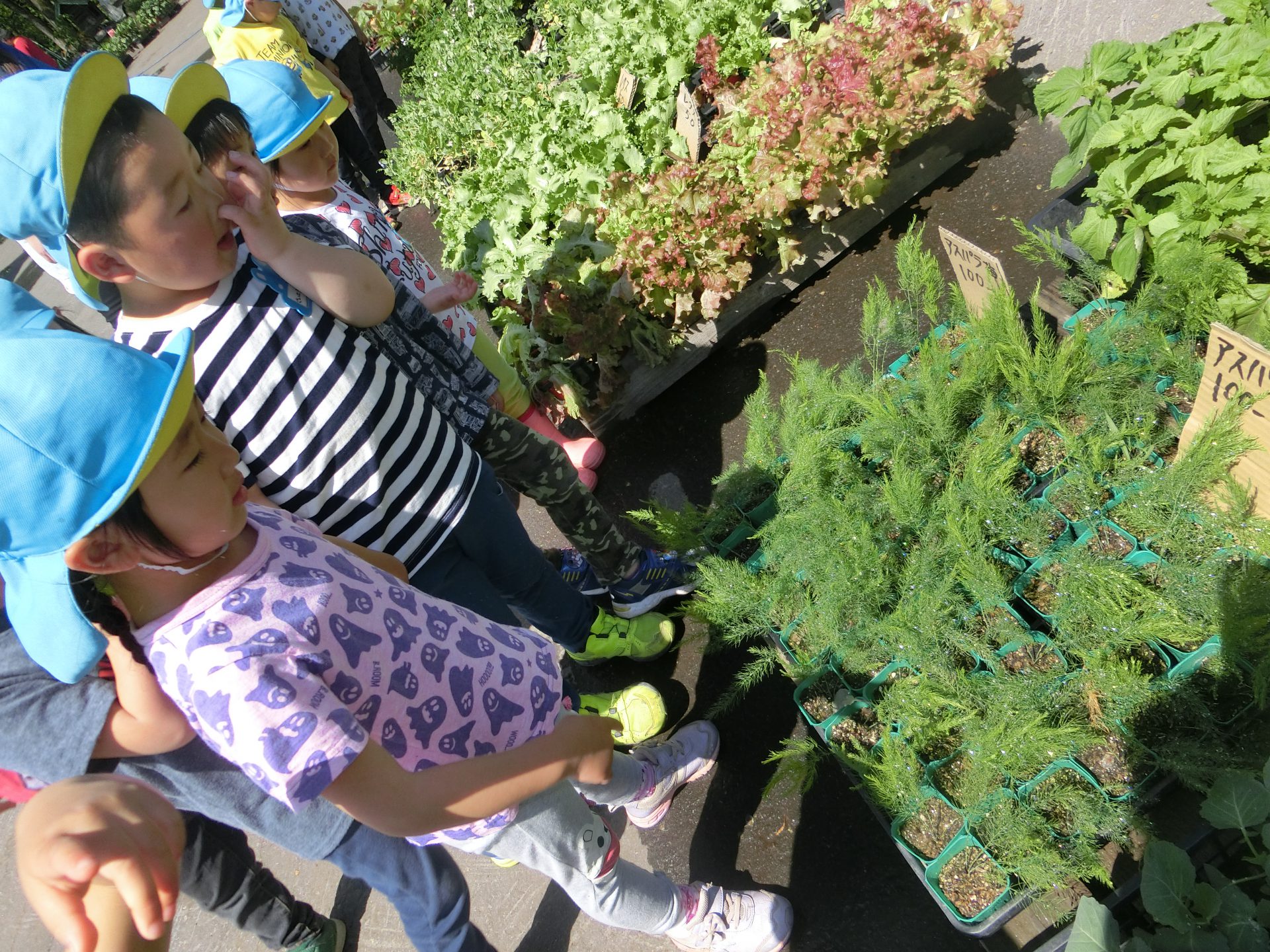 「たくさんあるね〜!」「メロンはどれだろう?」といろいろな野菜の苗を目にして、わくわくしているようでした。