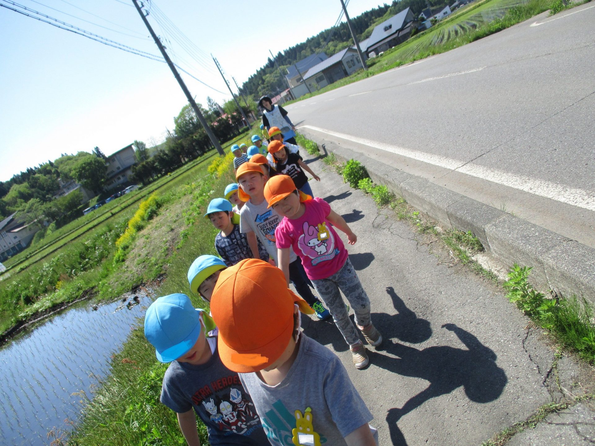 「今年は畑で何作りたい?」の問いから、「もろこし!」「だいこん!」「トマト!」「スイカがいい〜」などといろいろな野菜が出てきた中で、話し合って野菜を決める、その苗を買いに行く、植えるという野菜栽培の流れを自分たちの手で経験することができました。今はまだ小さい苗たちもこれからどんどん大きくなり野菜たちができてきます。その生長の様子を子どもたちと見守り、観察する力を育てていければいいなと思います。また、地域の方に話しかけることで「この種がいいよ。」などやさしく教えていただく場面もありました。これからも散歩の途中で出会った地域の方に挨拶をするなど、地域の方とのかかわりを大切にし自分の住んでいる町に親しみを持てればいいなと思います。