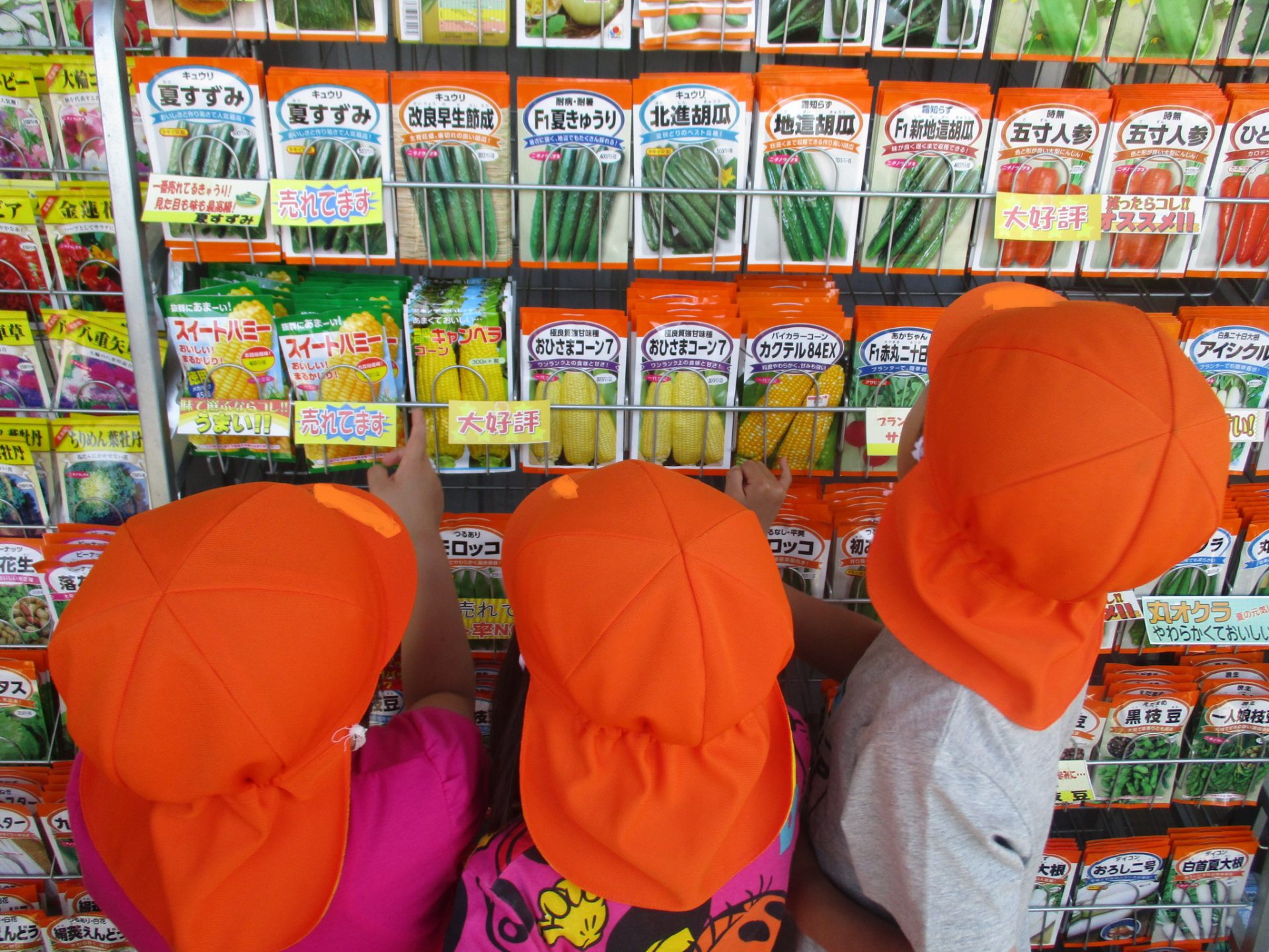 「とうもろこしの種いっぱいあるね。」「どれがいいんだろう?」