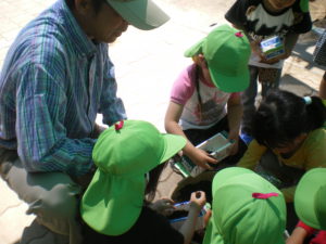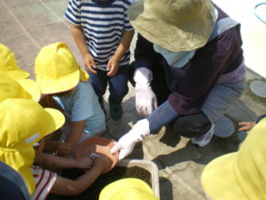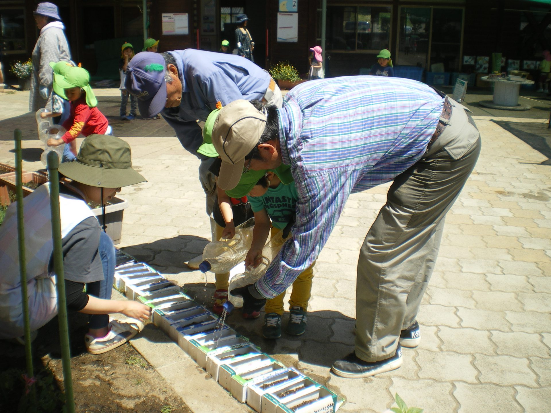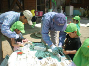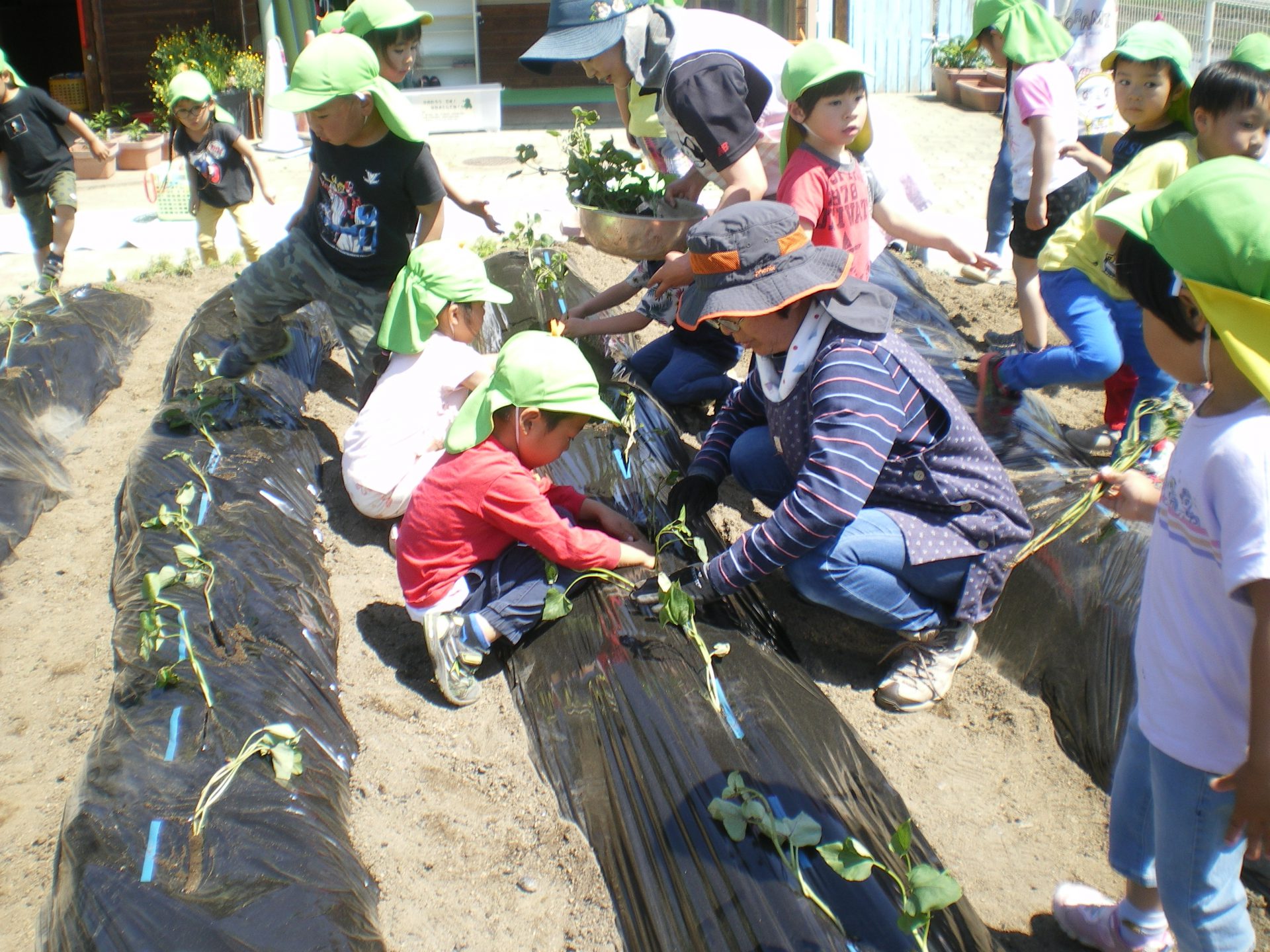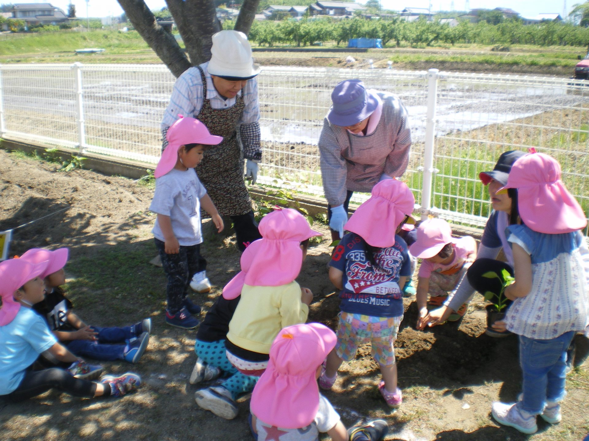 年中さんはさつま芋、年少さんはピーマンチームと人参チームに分かれて苗を植えたり、種をまきました。「この穴に苗をねんねさせてね。やさしく土をかけてあげようね」と教わりました。「あっ!水入れてない」と気づいた子もいましたが、おじいちゃんは「大丈夫、大丈夫。これからたくさんあげればいいんだよ」と大らかに仰ってくださいました。
