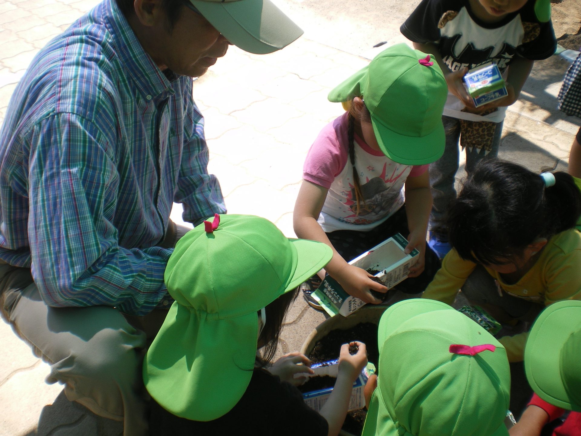 牛乳パックには二十日大根の種もまきました。小さい1歳児のお友達もプランターにまきました。