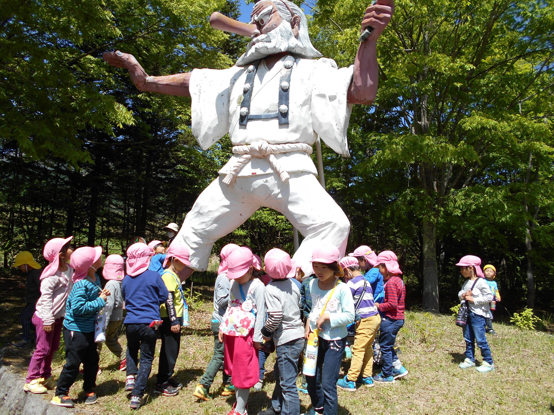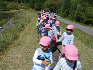 5月30日。連日の暑さがやわらぎ、気持ちの良い陽気のこの日。さみずっ子保育園の3歳以上児はバスに乗って園外保育へ。目指すは飯縄山の麓、冬のワカサギ釣りでも有名な霊仙寺湖です。