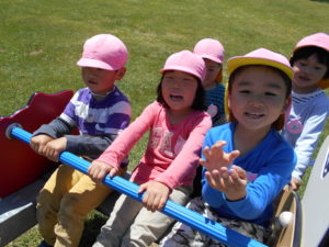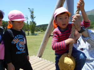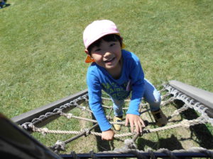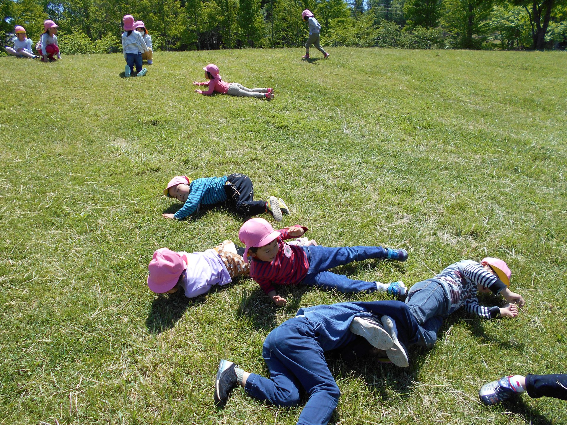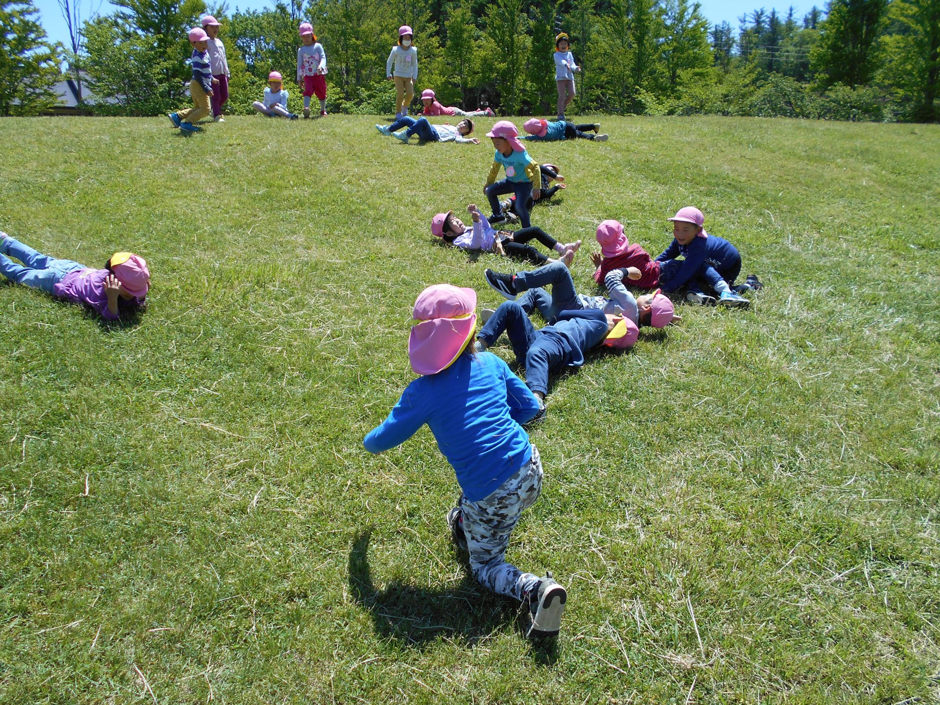 自然の多い飯綱町ですが、思い切り芝の上で転がれるという環境はなかなか見つからないもの…。今回の園外保育では園周辺とは違う環境で十分に体を動かし、自然を感じ、遊べたのではないかなと思います。
