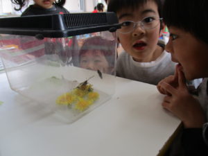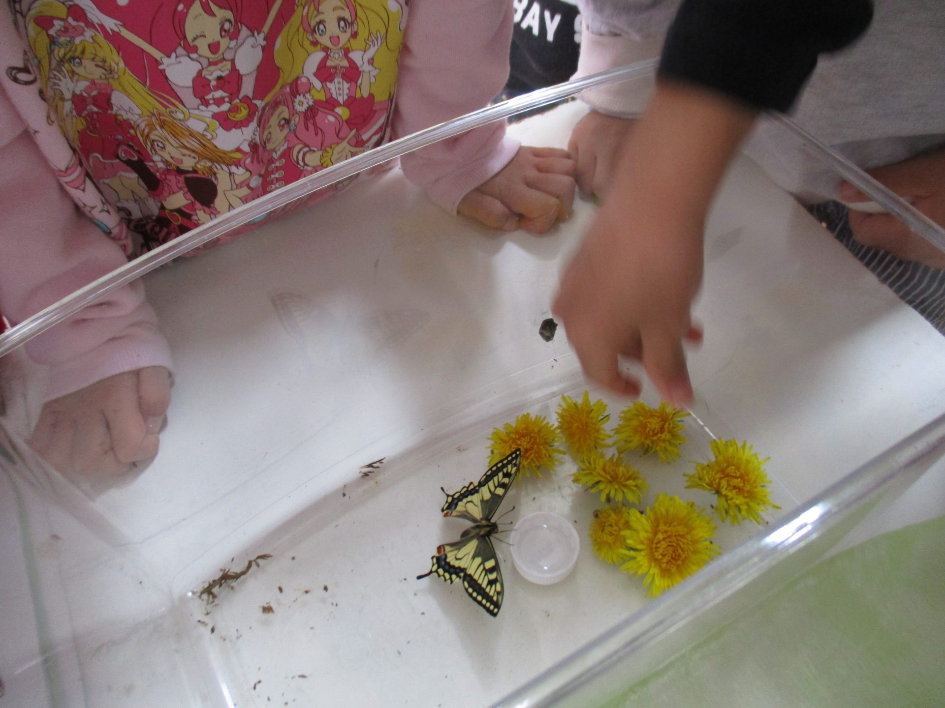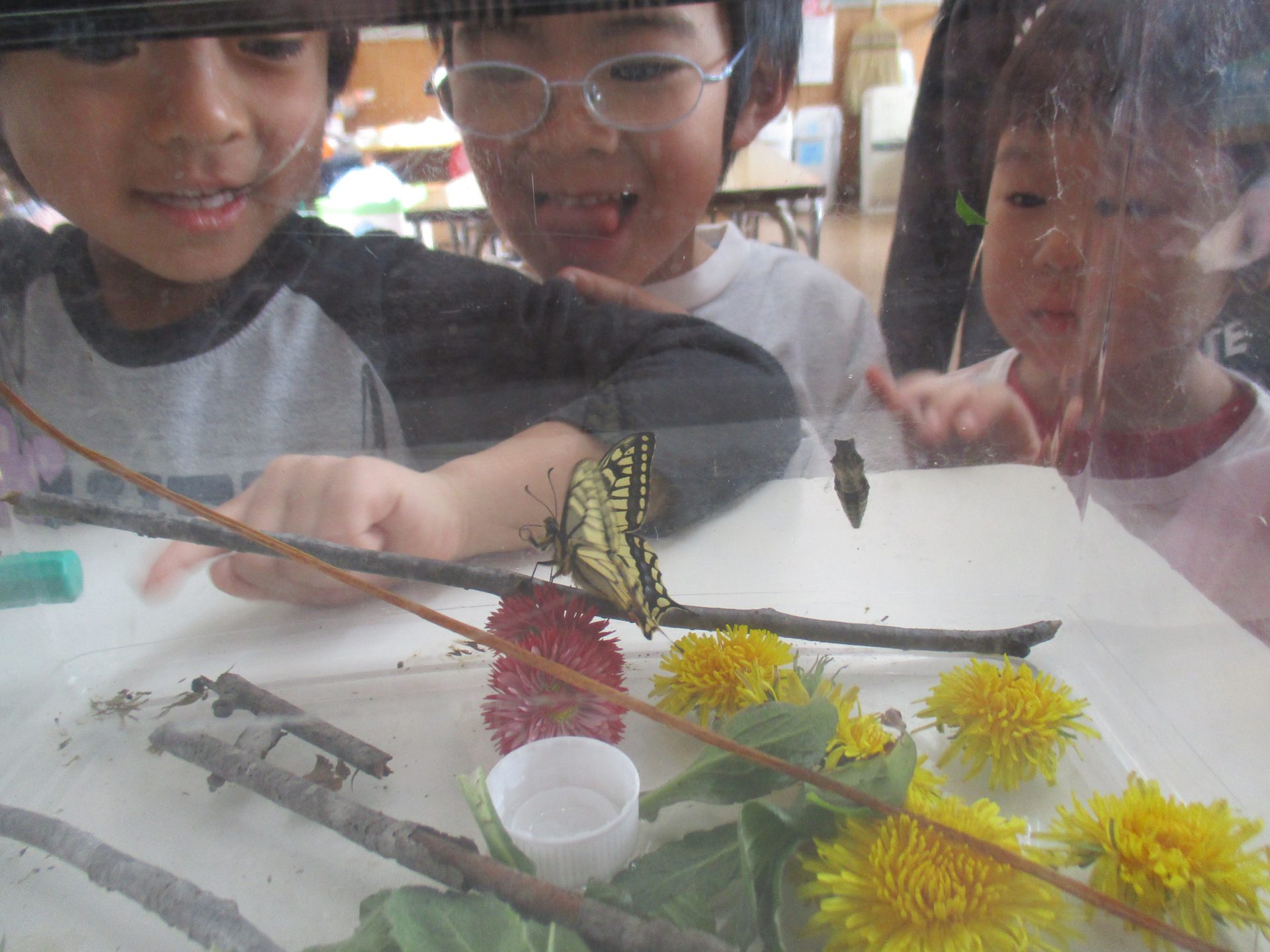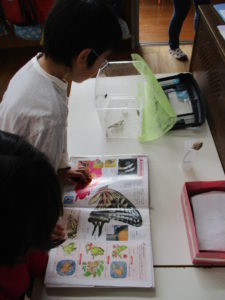 ケースの中で暴れているキアゲハを見て、「つかまるところがないからだ!」と外から小枝を拾ってきて、入れてあげる子ども達でした!