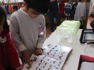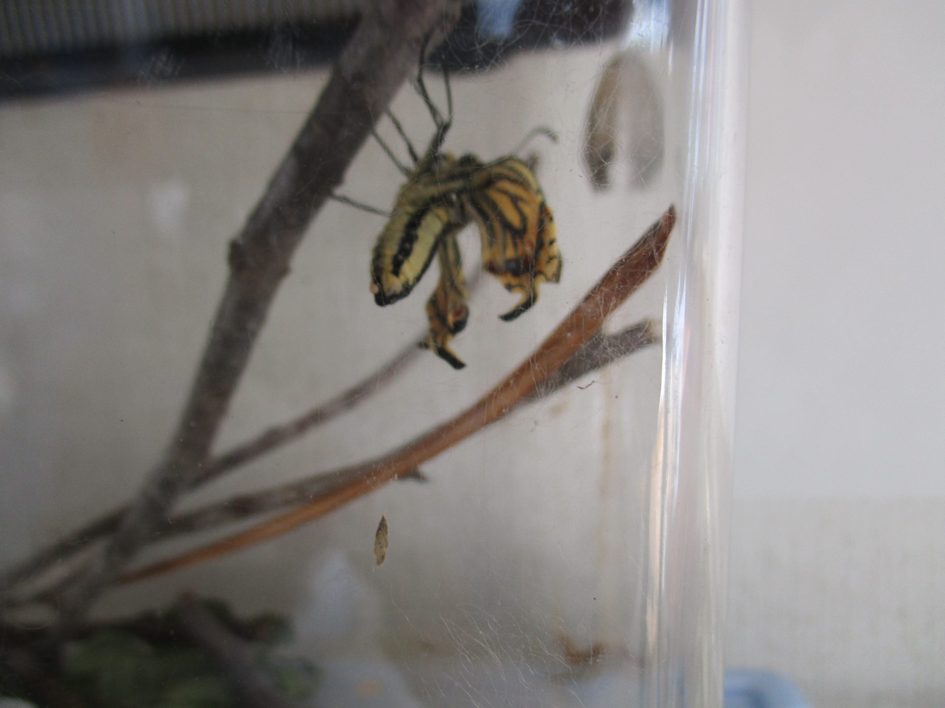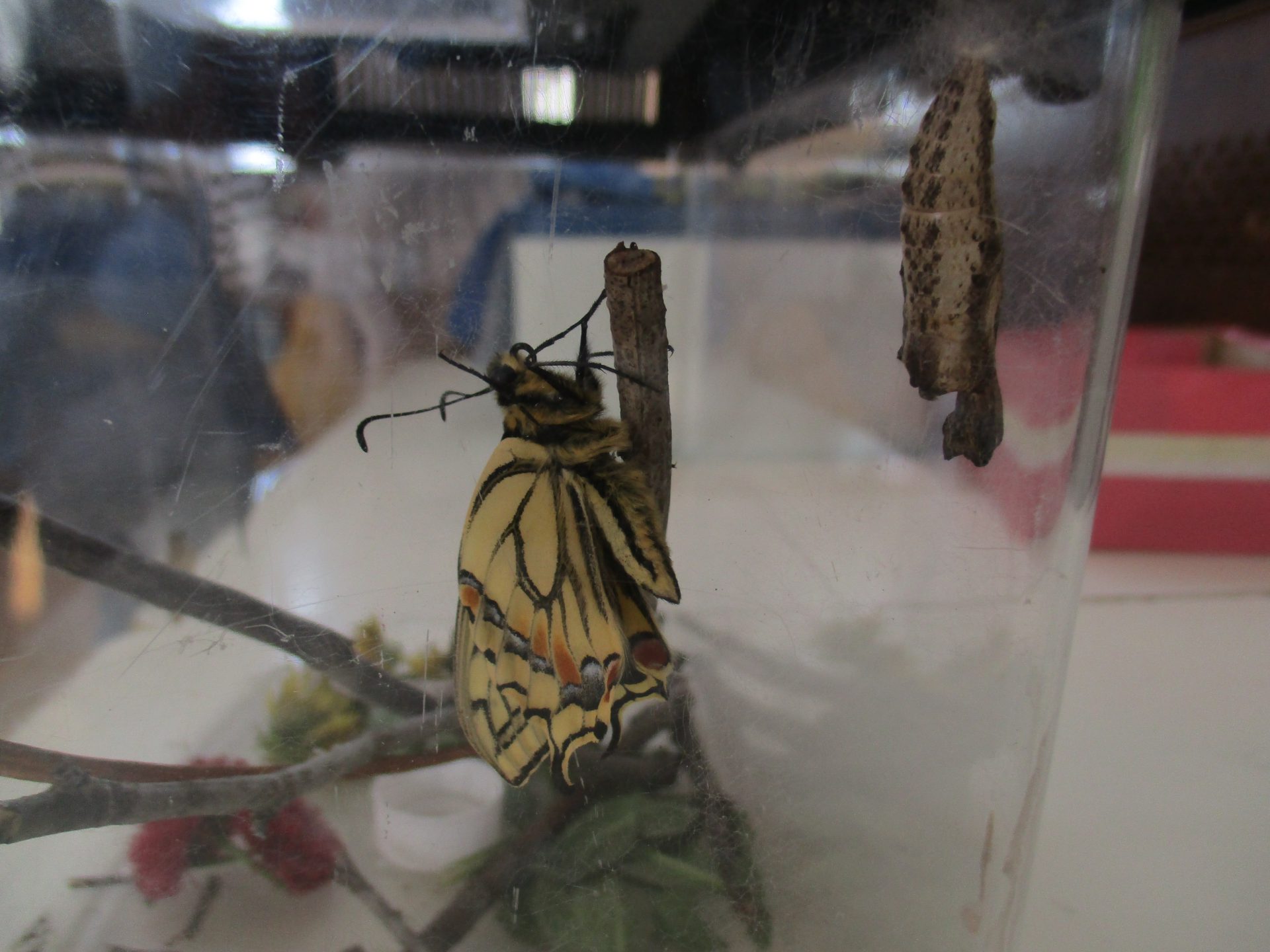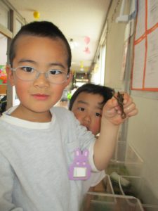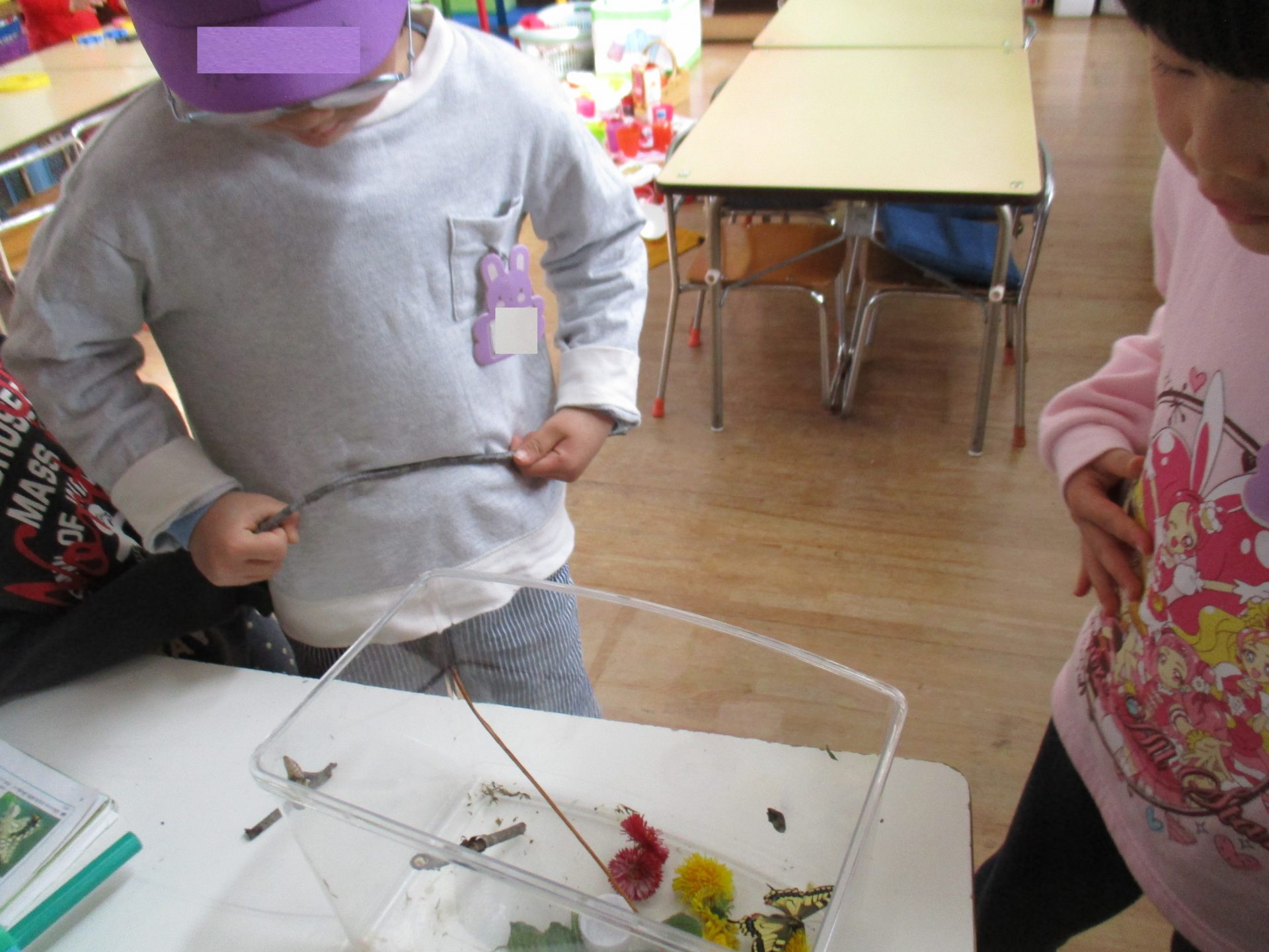 ケースの中で暴れているキアゲハを見て、「つかまるところがないからだ!」と外から小枝を拾ってきて、入れてあげる子ども達でした!
