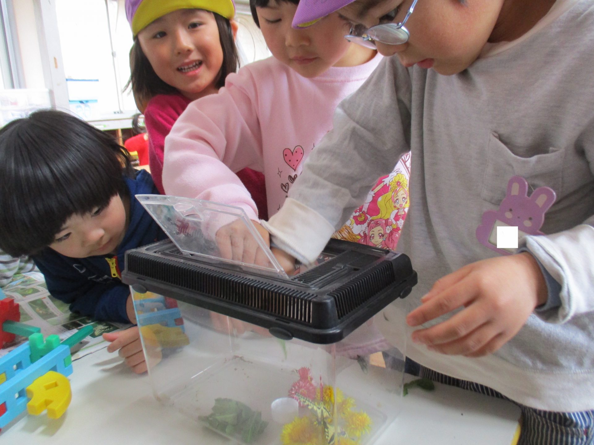 お腹が空いてるかもしれない!と園庭からタンポポの花を摘んできて入れてあげる子ども達でした!