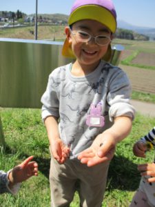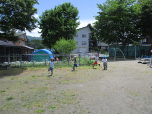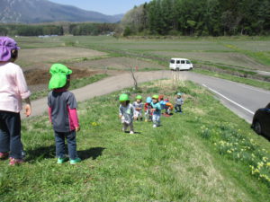今年度も始まったばかりですが、戸外あそびやお散歩に出掛け、のびのびと遊んでいる子どもたちです。すぐ近くに様々な生き物に触れられる環境があることに感謝し、 その中で身近な生き物に触れたり、四季を通して信濃町の自然に触れることで、感性豊に成長してほしいと思います。これからも戸外での活動を多く取り入れ、充実させていきたいです。