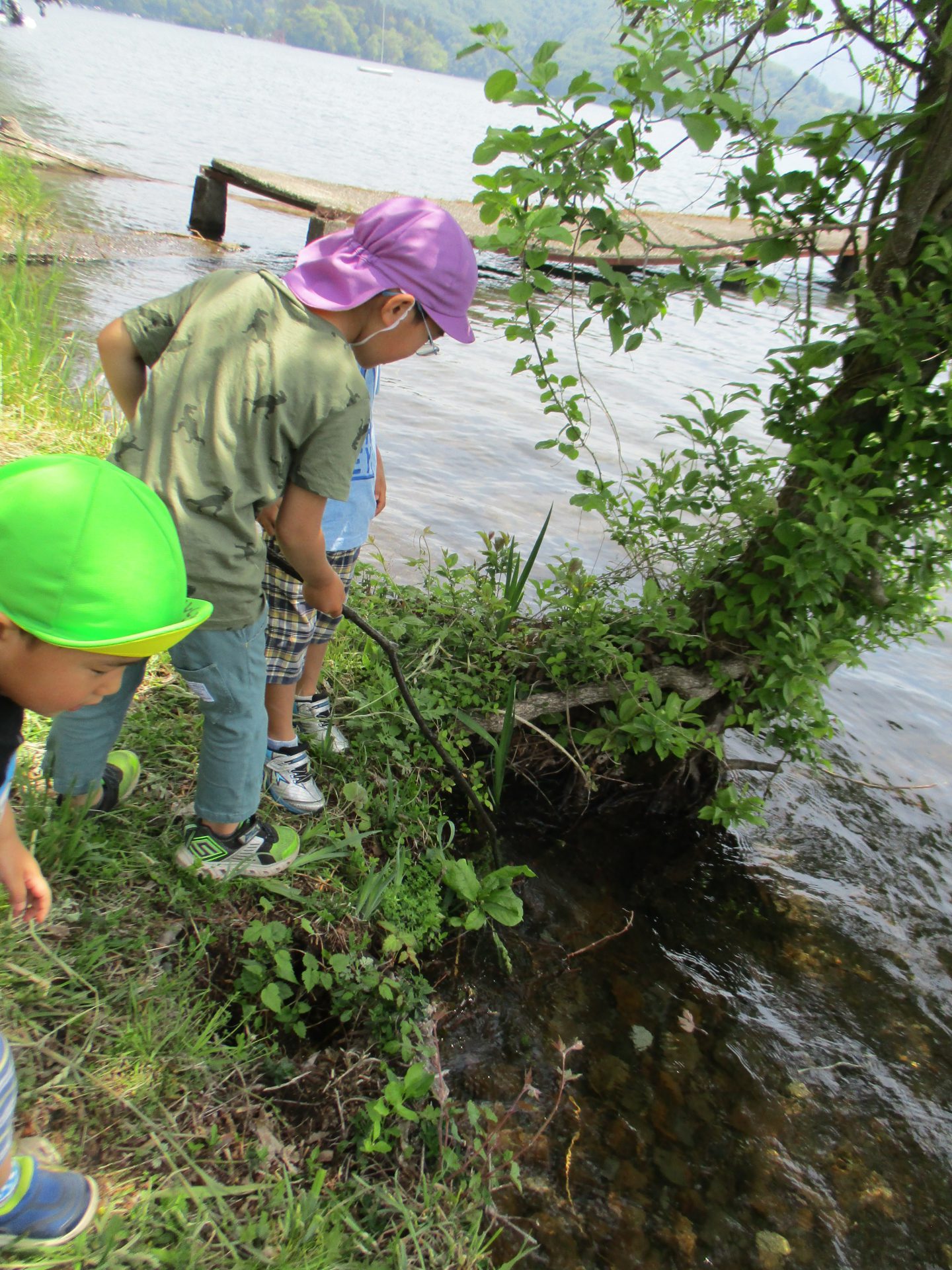 湖畔から野尻湖を覗き込めば、、、「エビだ!」「ワカサギ居るよ!」と波が揺らめく中でも、あっという間に発見する子ども達です!