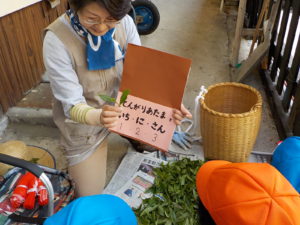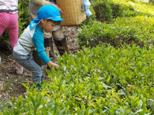 「お茶の葉を摘みに来ませんか?」と近所に住む和田保育園の先生から声をかけていただき、近くにあるお茶畑へお茶の葉を摘みにでかけました。上村は飯田市の中でもお茶を栽培している地区の一つです。自分たちの住んでいる地域で、毎日飲んでいるお茶を作っていることを知ってもらういい機会です。さっそく出かけました。