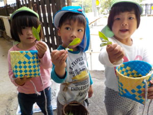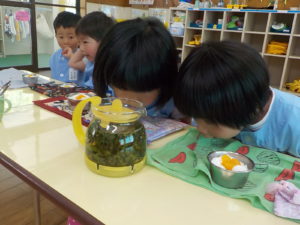 子ども達は思った以上にお茶摘みに夢中になりました。今回の一連の作業では、しっかり五感を働かすことができました。葉っぱの変化を見る、手で葉を摘む、もむ、匂いを嗅ぐ、味わう。これをきっかけにお茶に興味や親しみを持ってもらえたら嬉しいです。