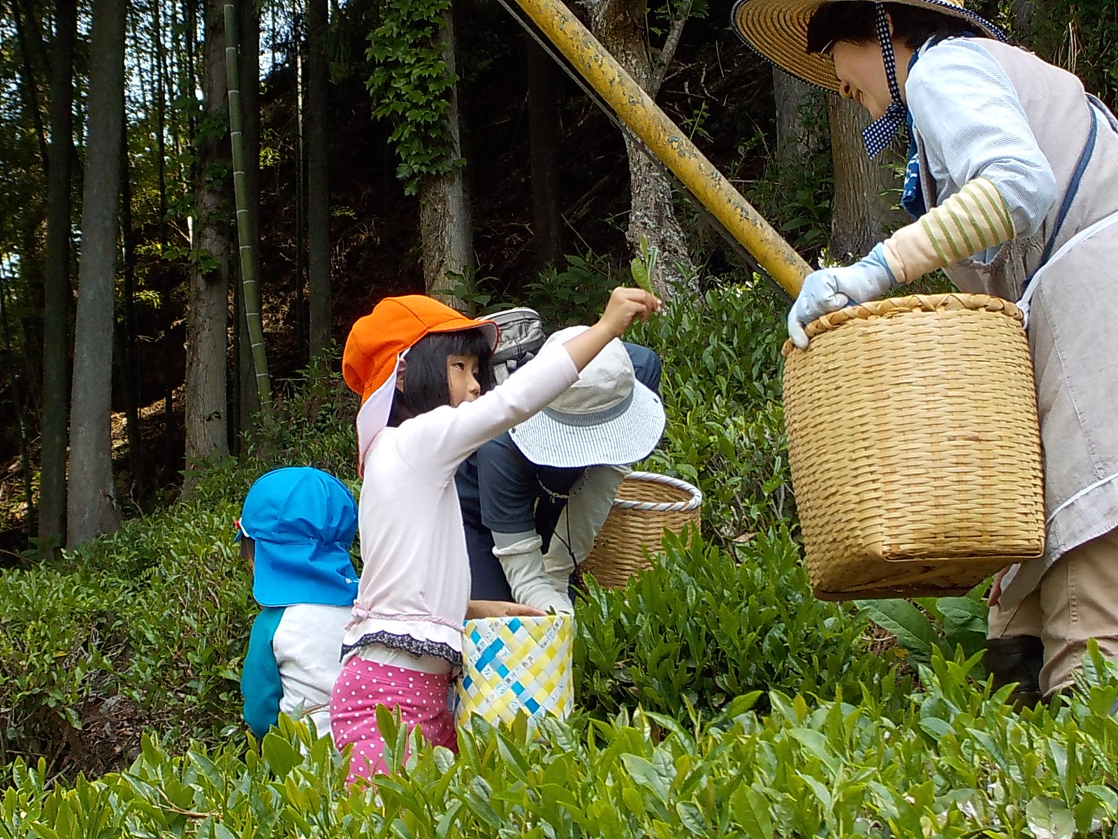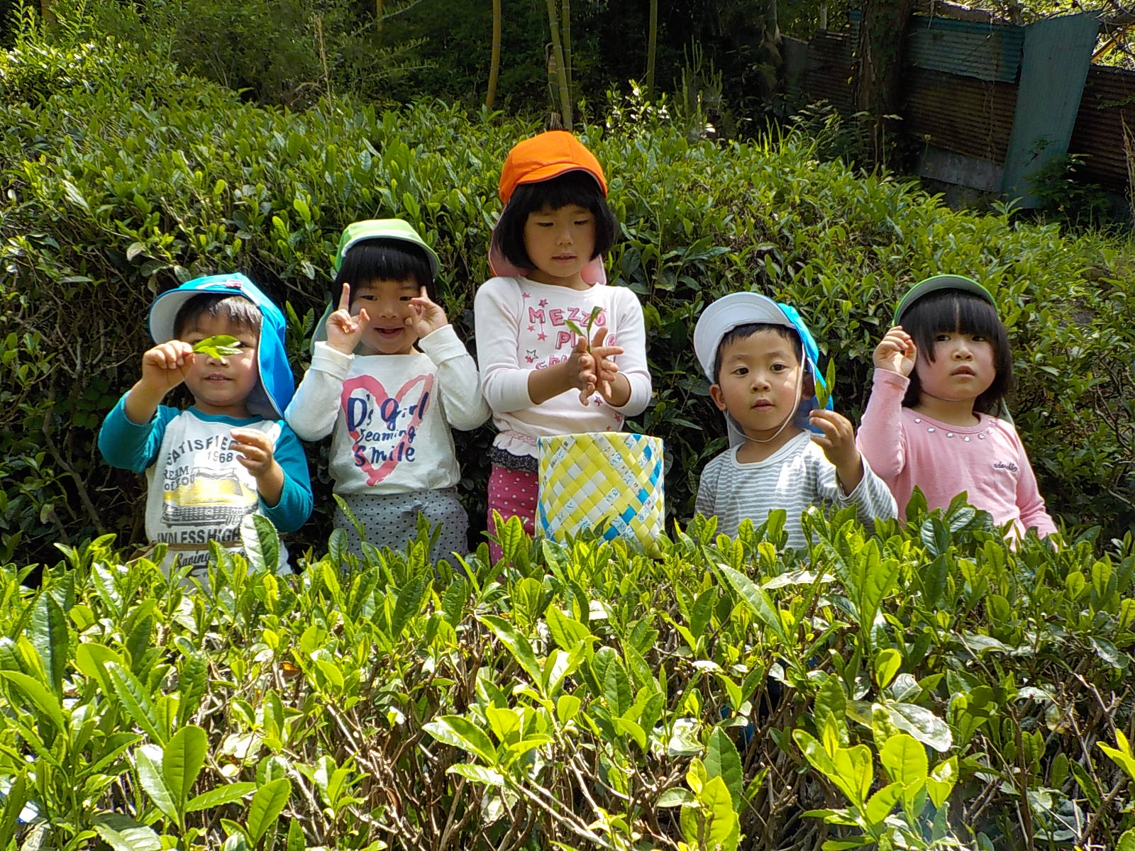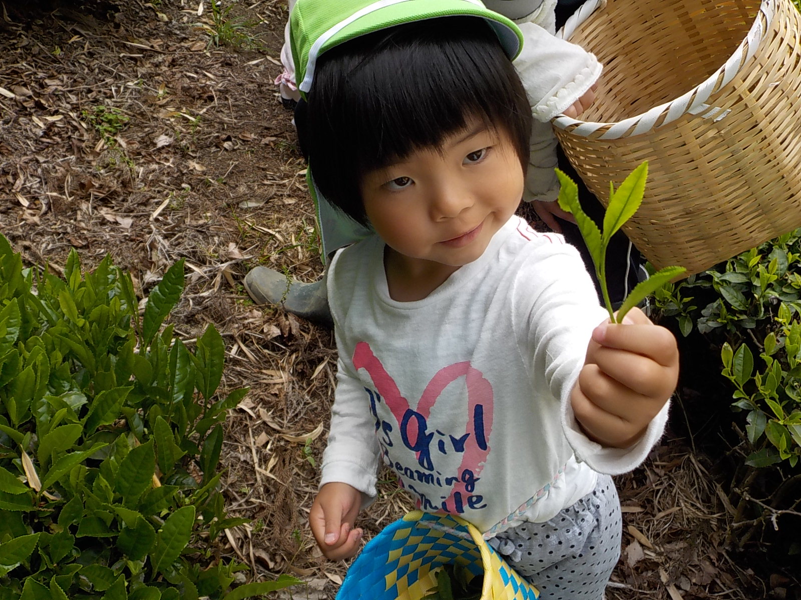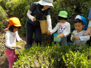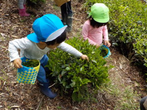 「お茶の葉を摘みに来ませんか?」と近所に住む和田保育園の先生から声をかけていただき、近くにあるお茶畑へお茶の葉を摘みにでかけました。上村は飯田市の中でもお茶を栽培している地区の一つです。自分たちの住んでいる地域で、毎日飲んでいるお茶を作っていることを知ってもらういい機会です。さっそく出かけました。