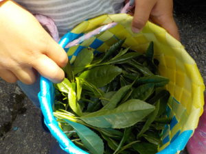 「お茶の葉は新芽の先から三枚くらいを摘むんだよ。」