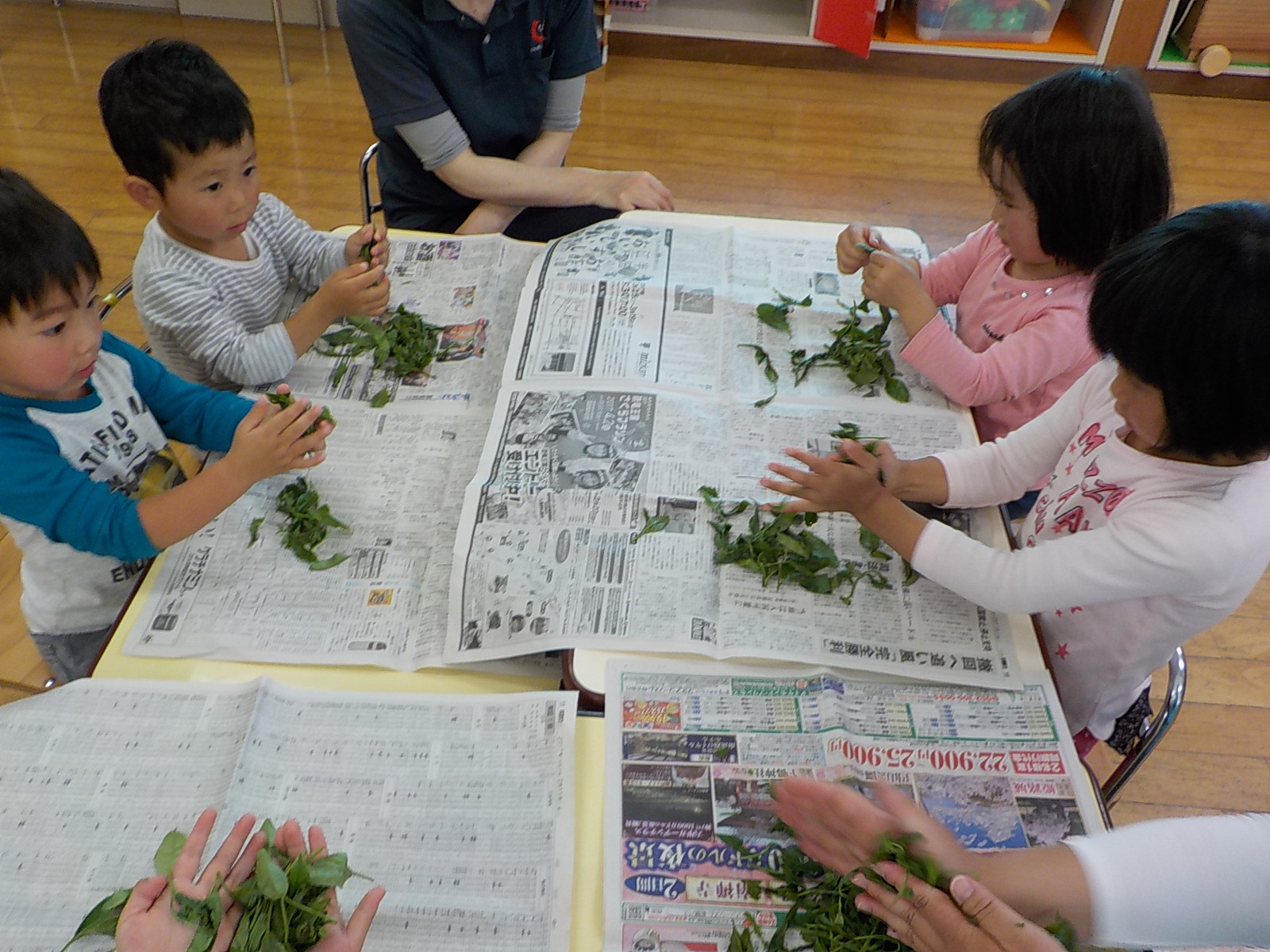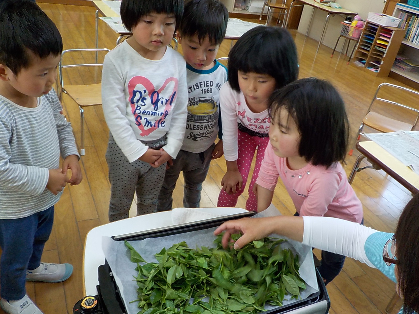 子ども達は思った以上にお茶摘みに夢中になりました。今回の一連の作業では、しっかり五感を働かすことができました。葉っぱの変化を見る、手で葉を摘む、もむ、匂いを嗅ぐ、味わう。これをきっかけにお茶に興味や親しみを持ってもらえたら嬉しいです。